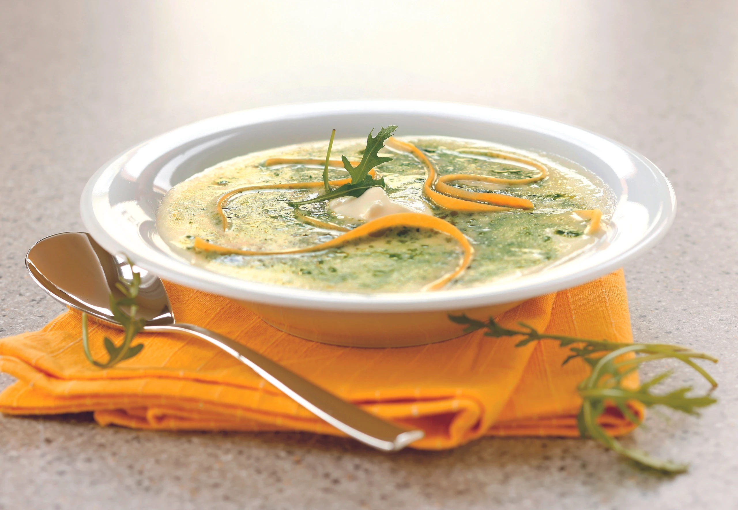 Für die Einlage Gelbe Rüben schälen und mit einem Schäler dünne Streifen abschneiden. Rucola putzen, 4 Blätter für die Garnitur reservieren. Übrigen Rucola schneiden und mit Öl fein pürieren.