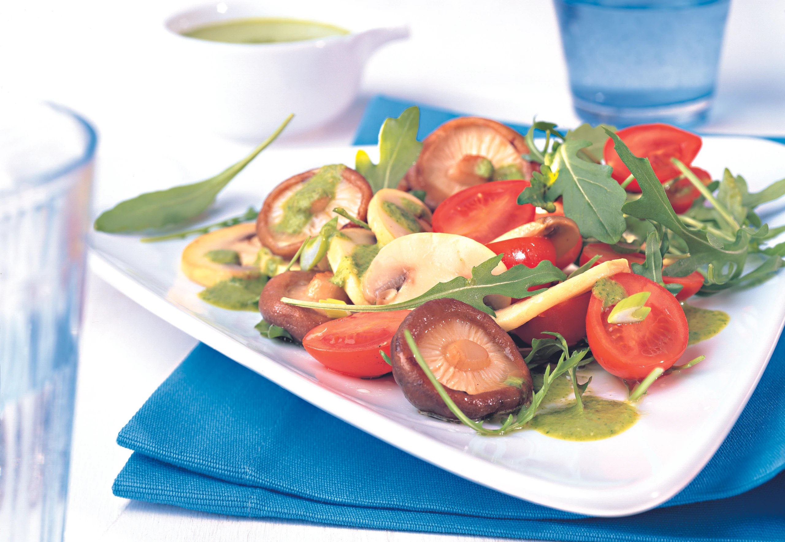Champignons in Scheiben schneiden. Kleine Shiitake ganz lassen, große vierteln. 1 TL Olivenöl erhitzen, Pilze darin unter Rühren kurz braten und auf dem Salat anrichten. Dressing darüber verteilen, Zwiebelringe darüber streuen.