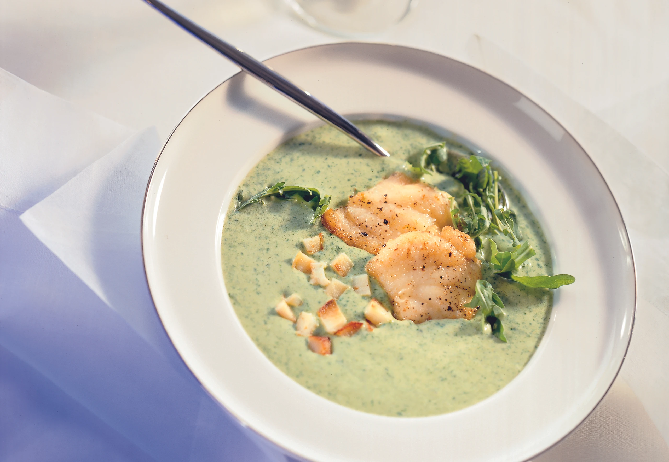 Seeteufel in Scheiben schneiden und mit Salz, Pfeffer und zerdrücktem Knoblauch würzen. Übriges Mehl und Brösel mischen, Fisch darin wenden und in Öl beidseitig braten. Suppe mit Fisch, Rucola und Erdäpfelwürfeln anrichten.