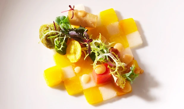 - Gelbe Bete- und Birnenstücke im Schachbrettmuster auf Teller legen, mit Vinaigrette bestreichen. Kohlbällchen und Pilzröllchen darauf setzen, Salatblättchen darauf drapieren, mit Mayonnaise garnieren, mit Vinaigrette beträufeln. Mit getrockneten Rüben- und Birnenscheiben und einer karamellisierten Nuss garnieren.