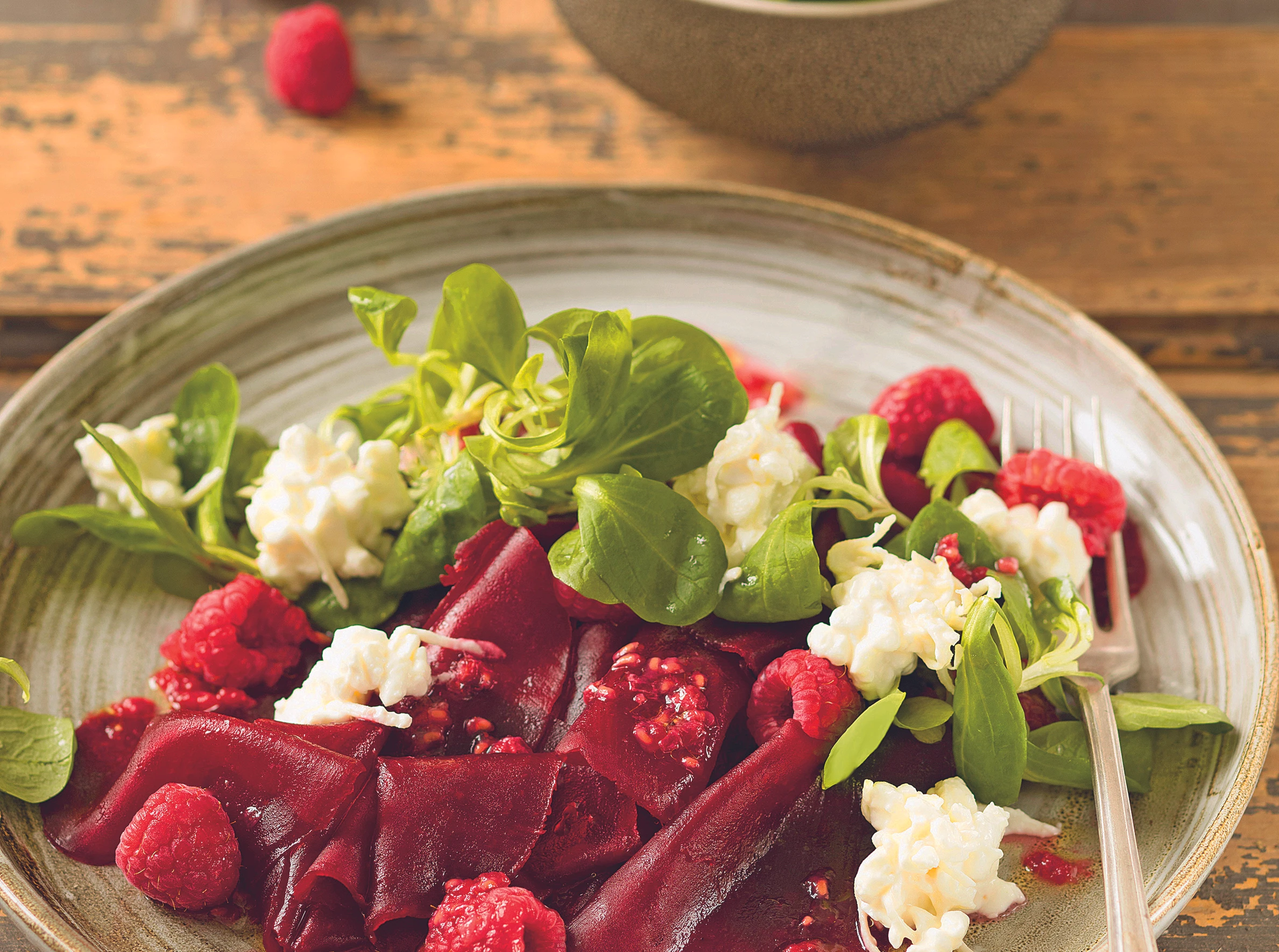 Rüben und Himbeeren dekorativ auf Tellern anrichten, mit Vogerlsalat belegen und mit der Marinade beträufeln. Cottage Cheese in kleinen Portionen darüber streuen.