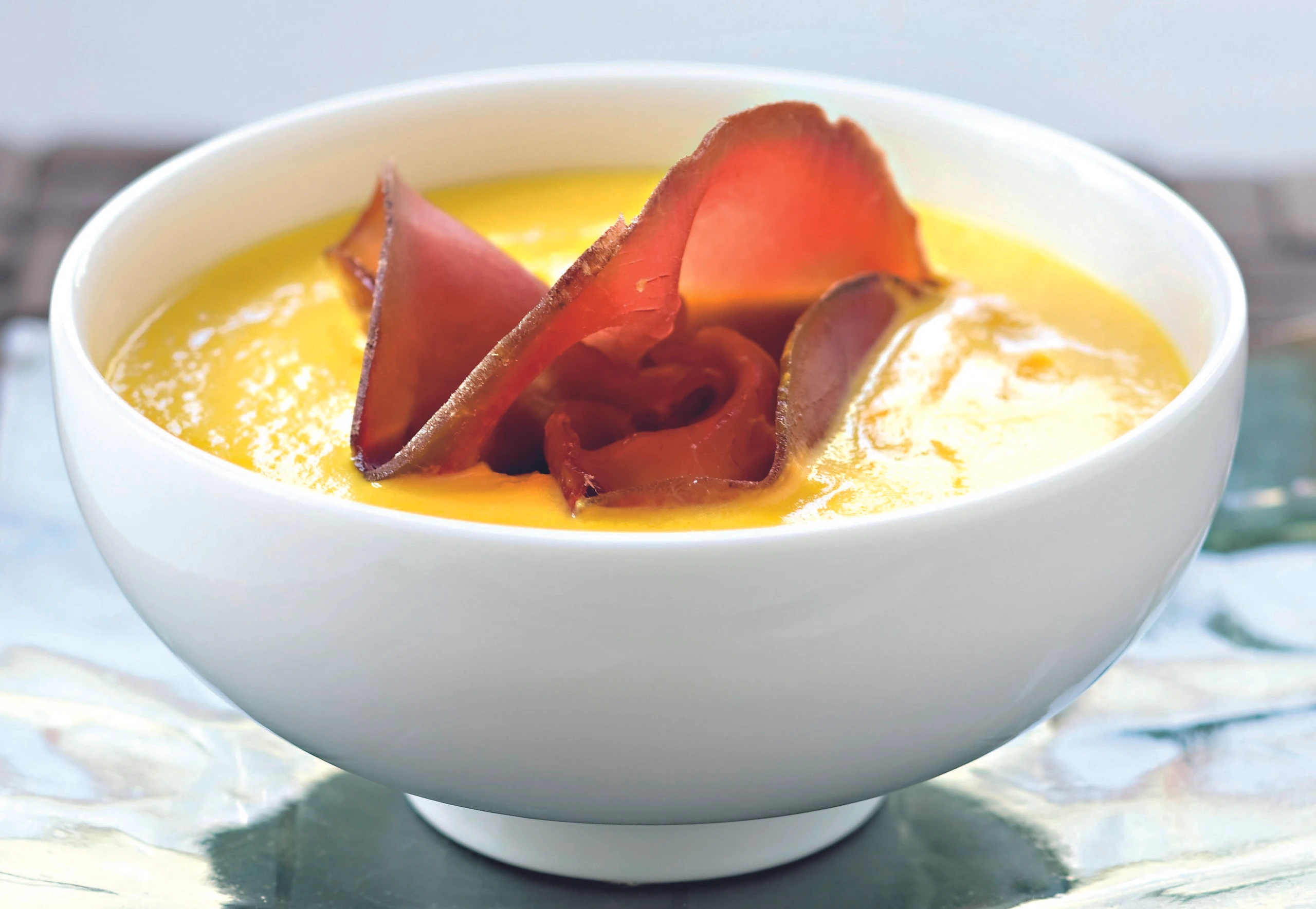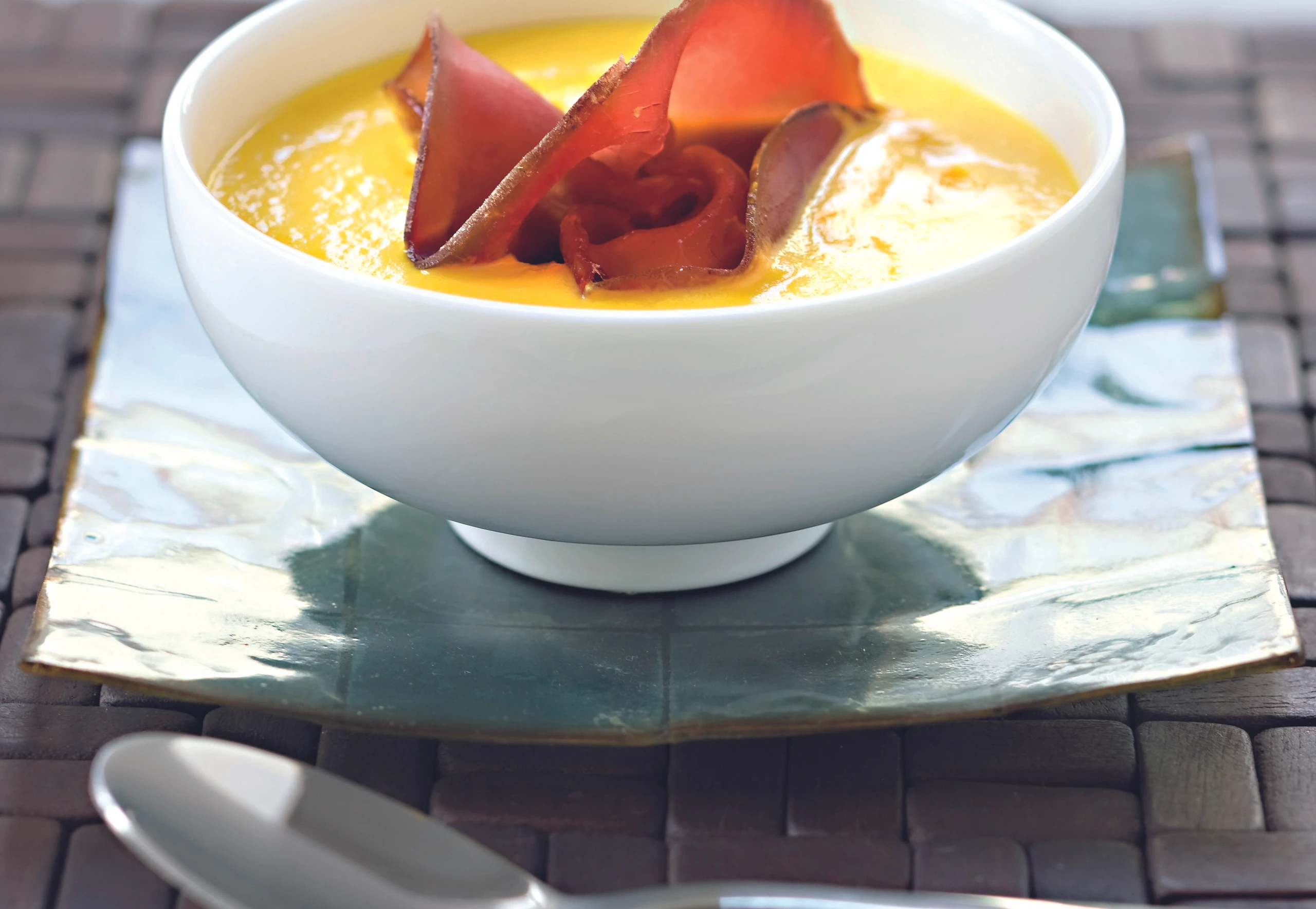 Für die Einlage Bündner Fleisch zu Röschen drehen. Suppe damit garniert servieren.