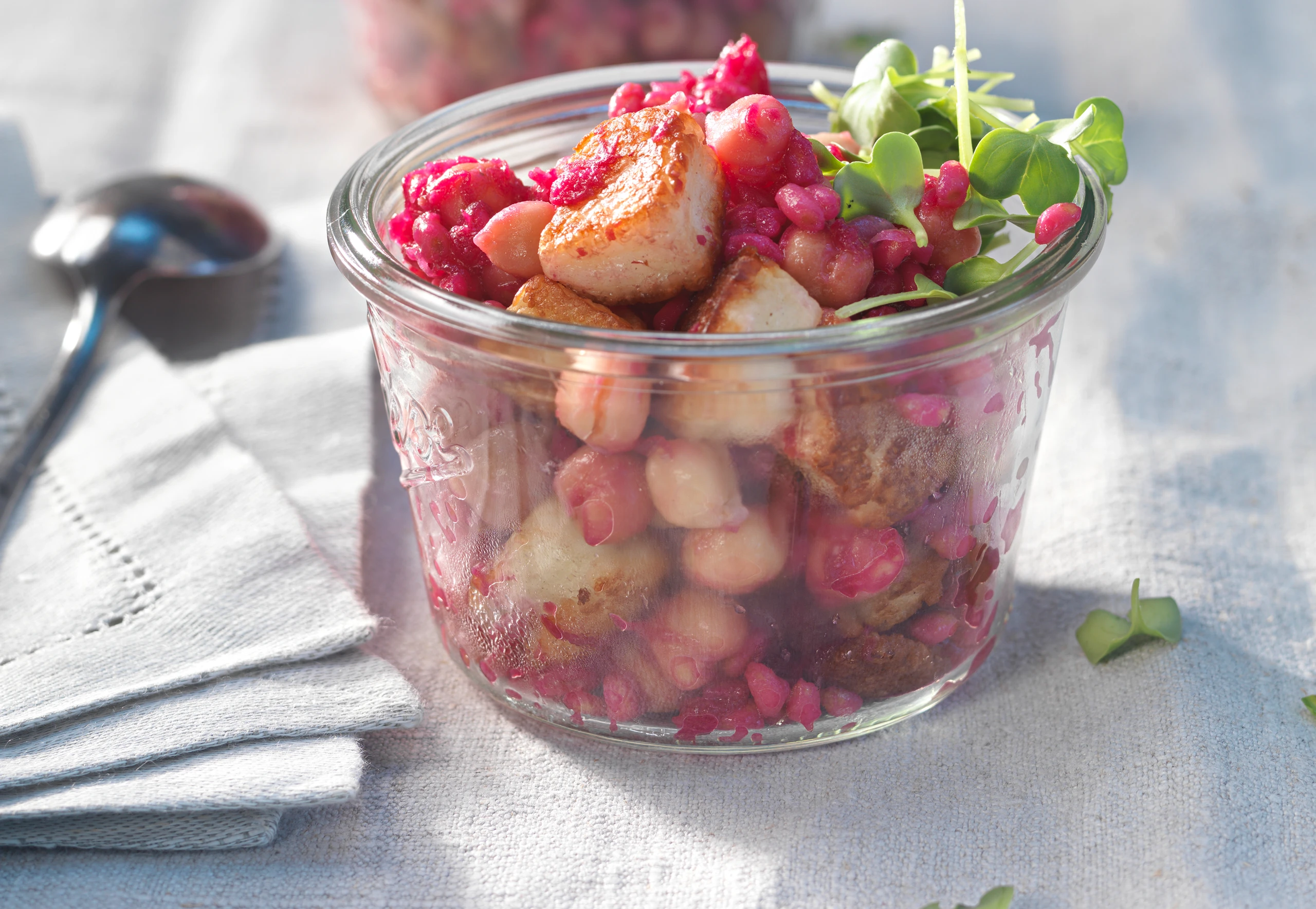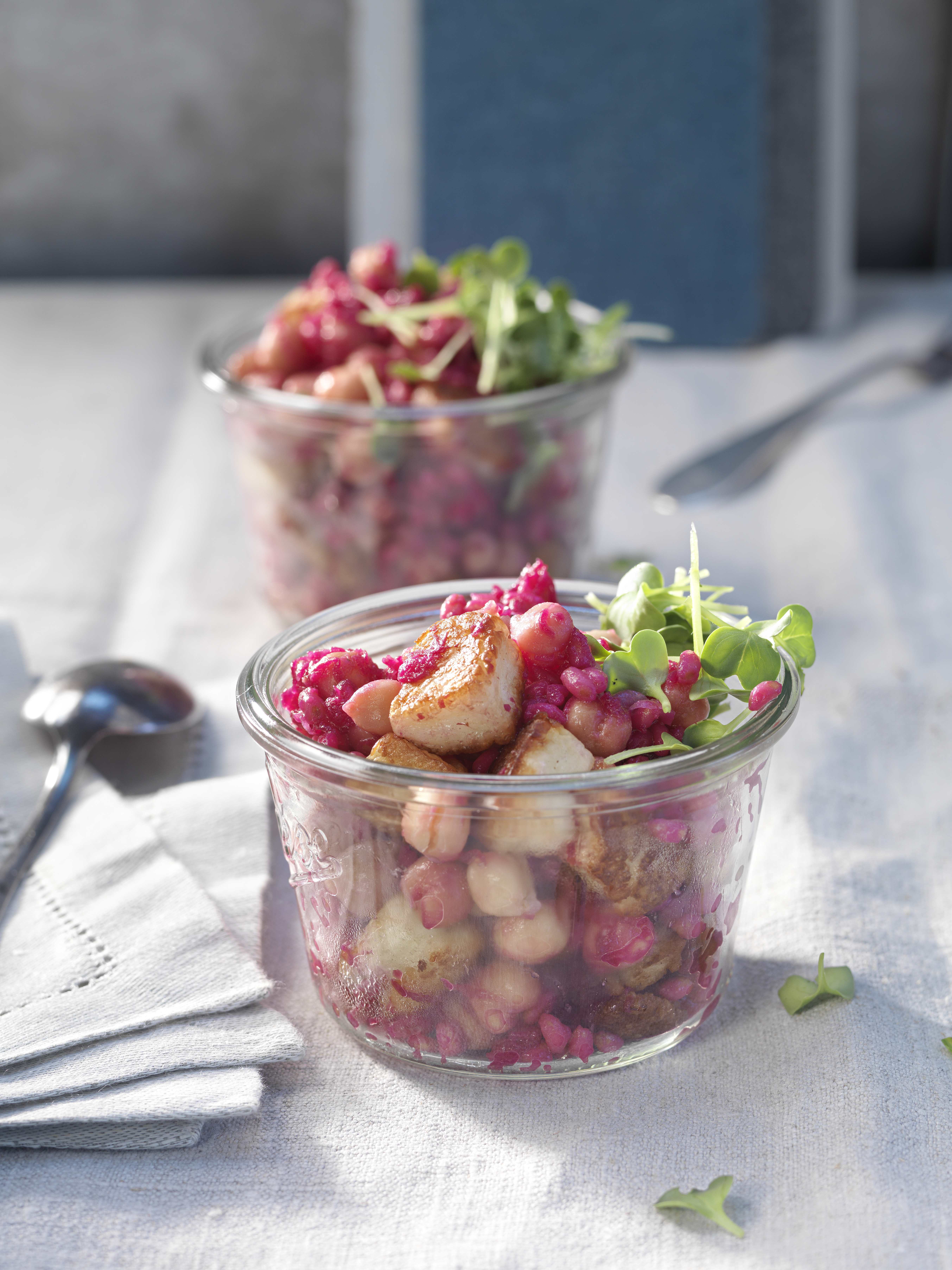 Für die Marinade Zitronensaft mit je 1/2 TL Senf und Honig, 2 Prisen Kümmel sowie 2 EL Öl verrühren. Weizen, Rüben, Kichererbsen, Zwiebelgrün und Marinade vermischen und kurz ziehen lassen.