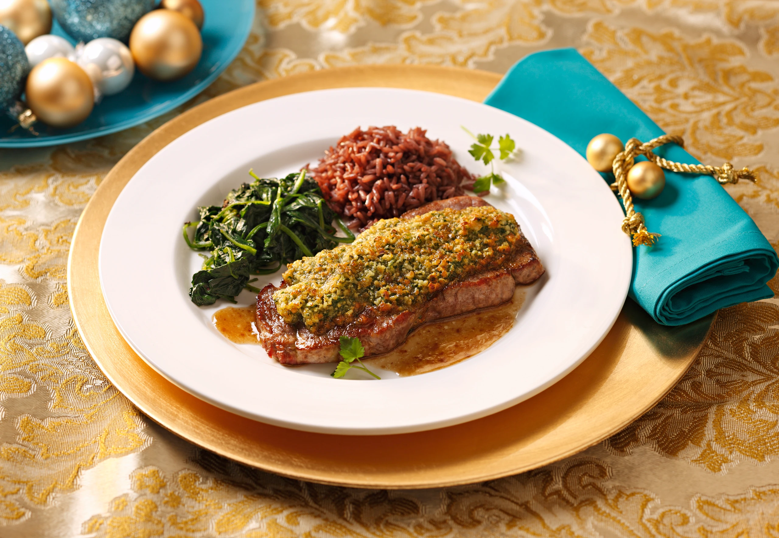 Für die Kruste Pignoli in einem Kutter pürieren, mit zerdrücktem Knoblauch, Butter und Petersilie verrühren, mit Salz und Pfeffer würzen.