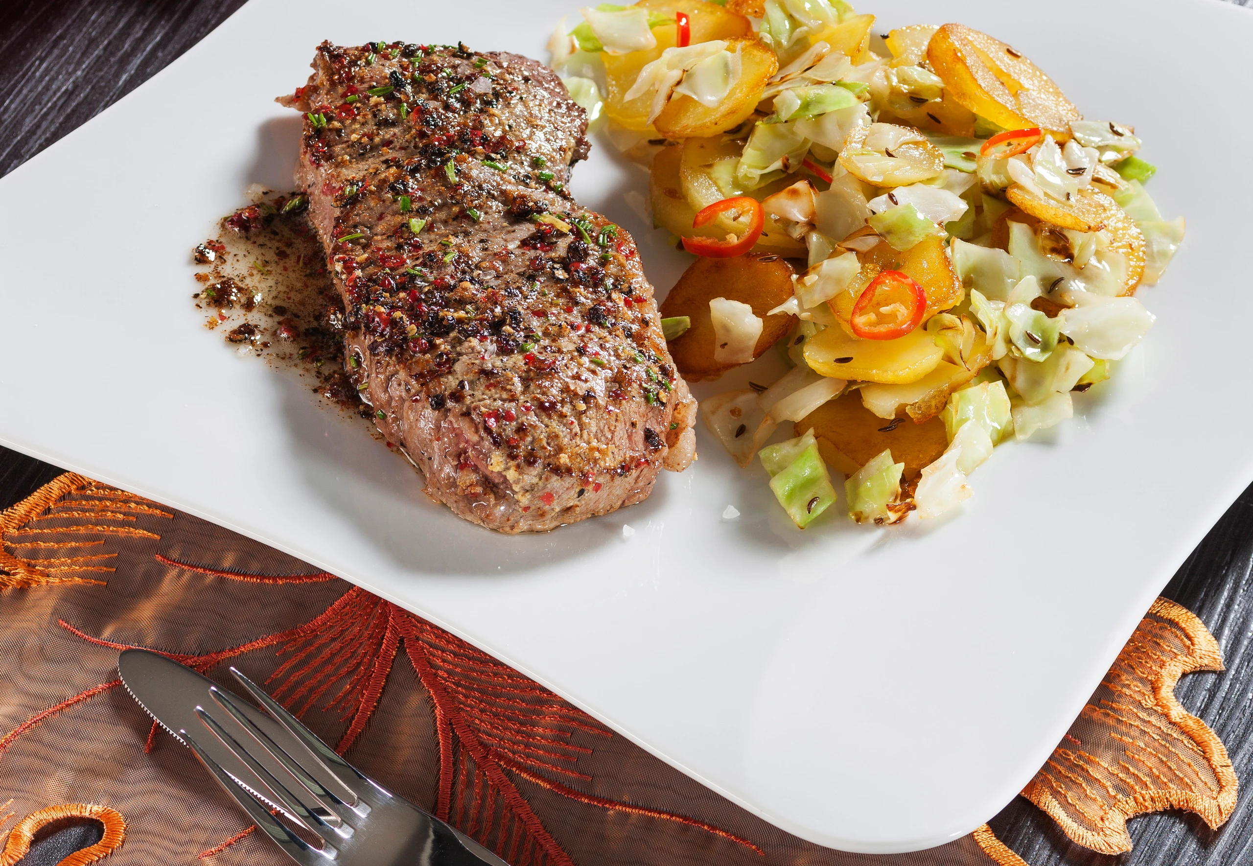 - Steaks beidseitig salzen, mit Senf bestreichen, mit Rosmarin und Pfeffer bestreuen. In einer Pfanne 3 EL Öl erhitzen, Fleisch darin beidseitig braten. Fleisch herausnehmen und mit dem Gröstl anrichten.