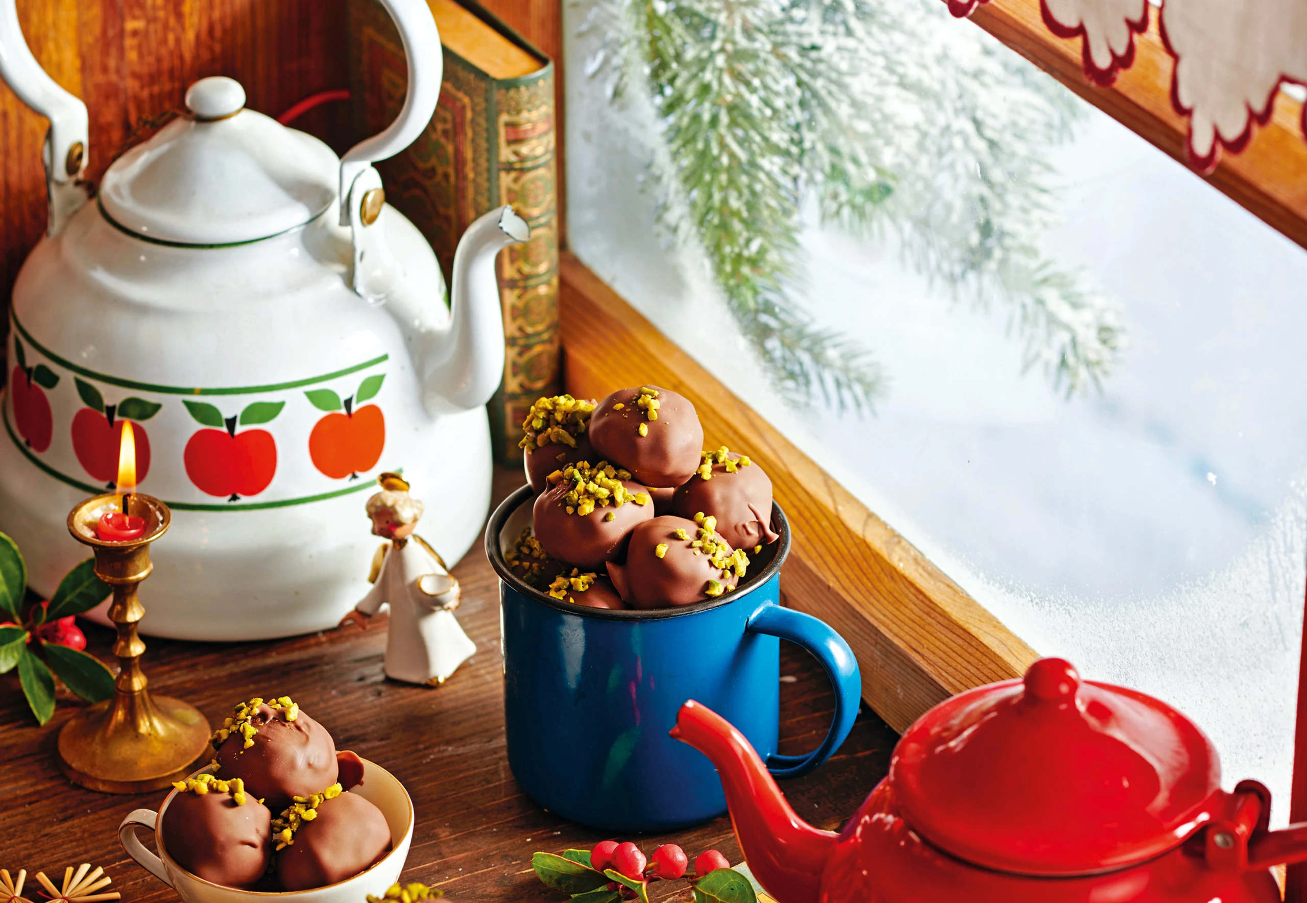 Kugerl in die Kuvertüre tunken und gut abtropfen lassen. Auf Backpapier setzen, mit Pistazien bestreuen und trocknen lassen.