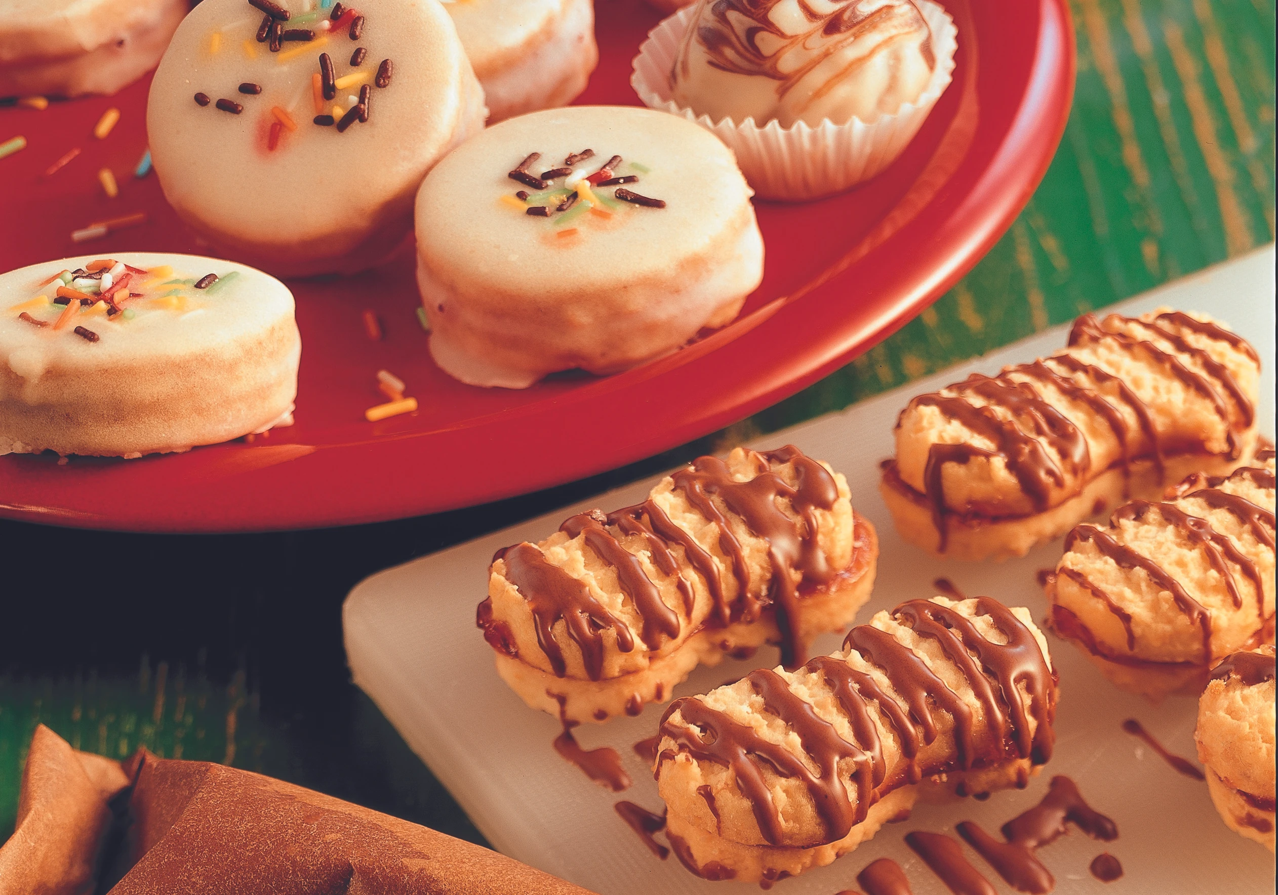 Teig 3–4 mm dick ausrollen. Scheiben (Ø ca. 4 cm) ausstechen, auf die Bleche legen und ca. 10 Minuten (mittlere Schiene) hell backen. Kekse aus dem Rohr nehmen und auskühlen lassen. Je 2 Kekse mit Marmelade zusammensetzen.