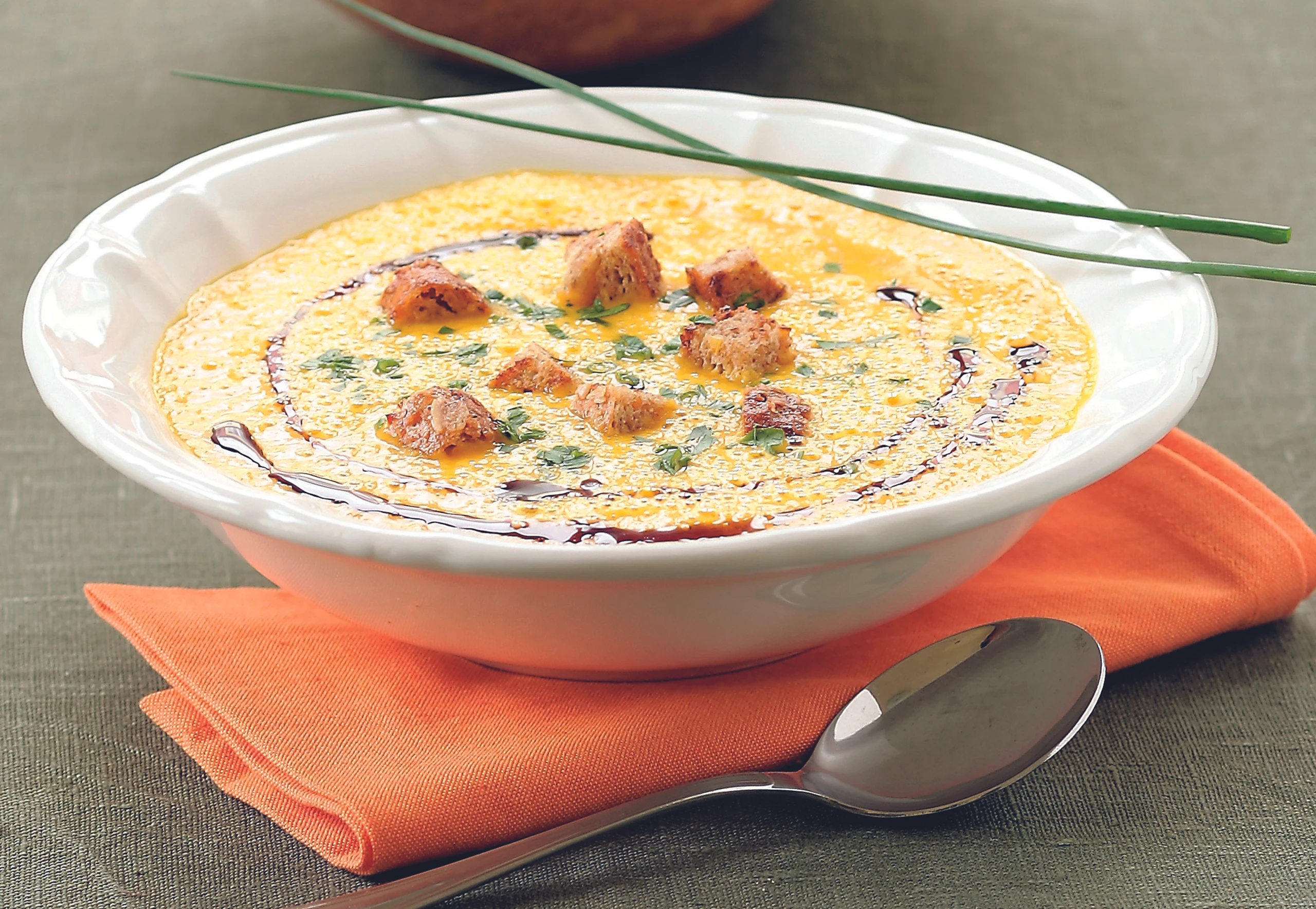 Semmelwürfel in Butter oder Margarine braten und gut abtropfen lassen. Suppe mit Kernöl und Semmelwürfeln garnieren.