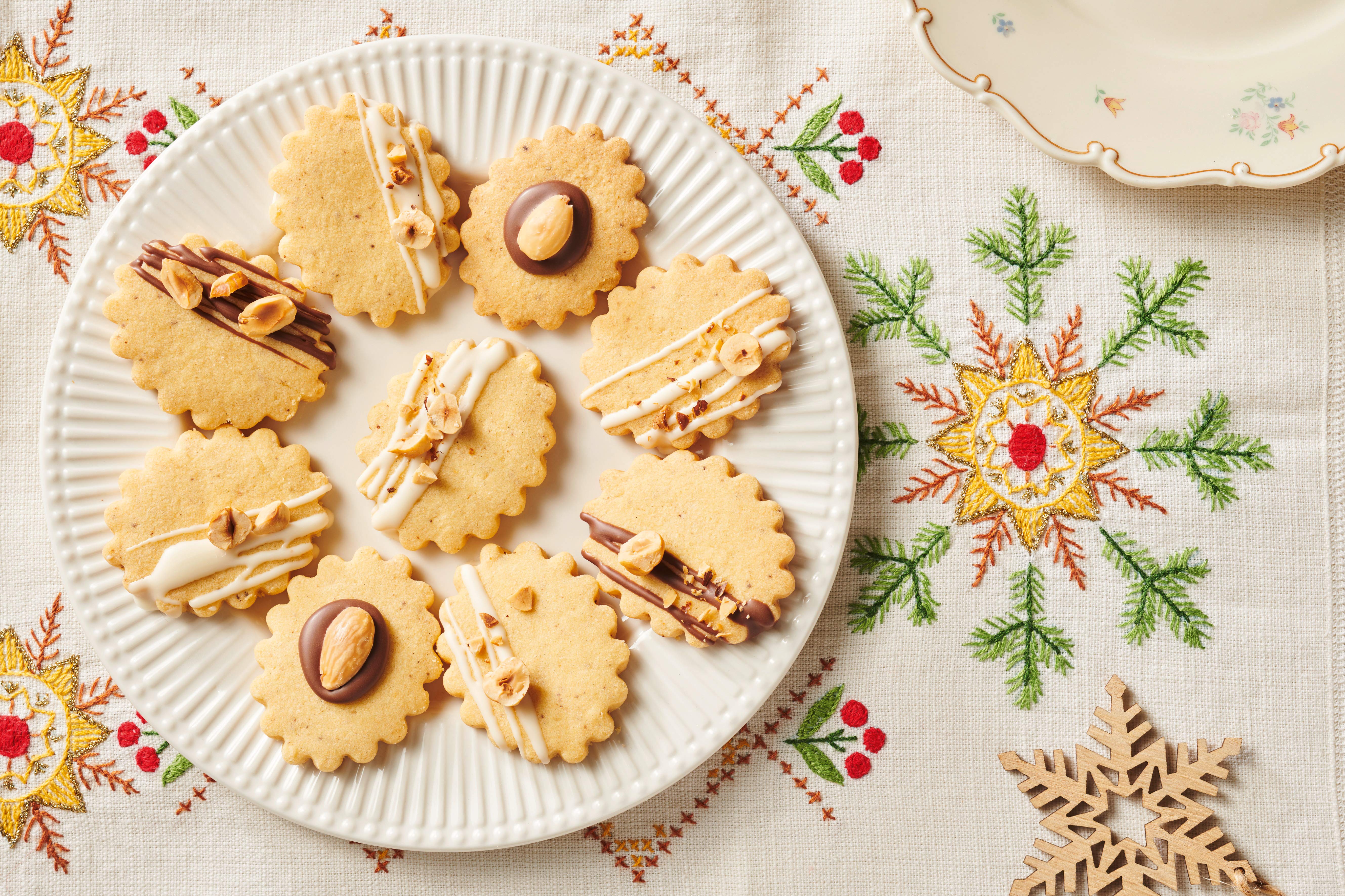 Kuvertüren getrennt über einem Wasserbad schmelzen und die Kekse damit beträufeln. Mit gehackten oder ganzen Mandeln verzieren.
