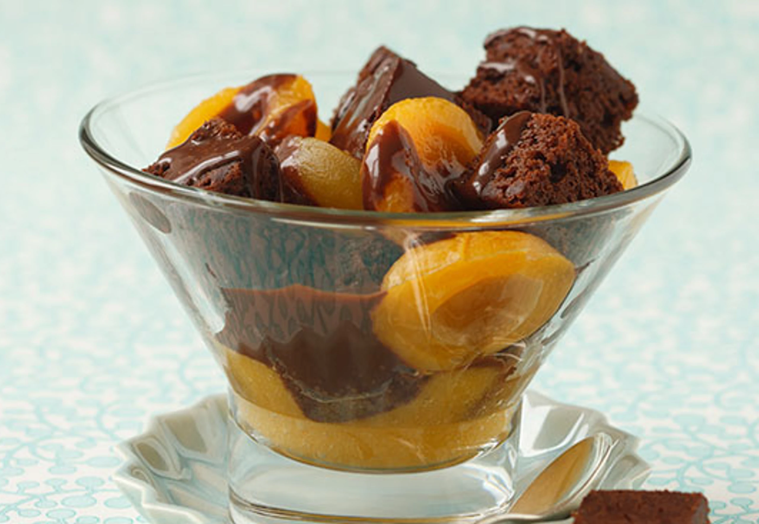 - Schokokuchen in ca. 2 cm große Würfel schneiden. Kuchen- und Marillenstücke mit der Marillensauce abwechselnd in die Gläser füllen und mit Schokosauce garniert servieren.
