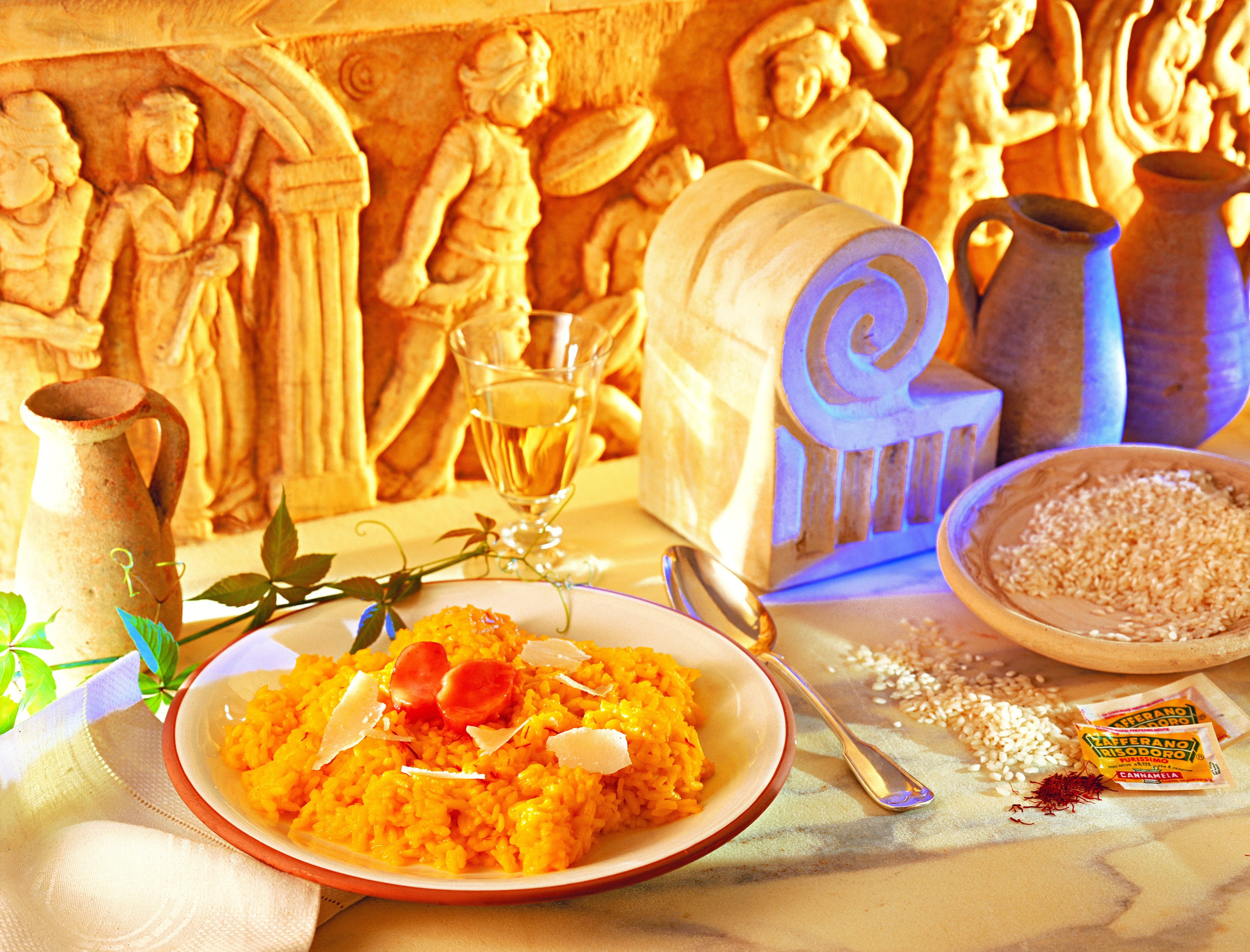 Reis mit Wein ablöschen und die Flüssigkeit einkochen. Safran zugeben und mit einem Achtel der Suppe aufgießen. Reis salzen und auf kleiner Flamme unter ständigem Rühren köcheln.