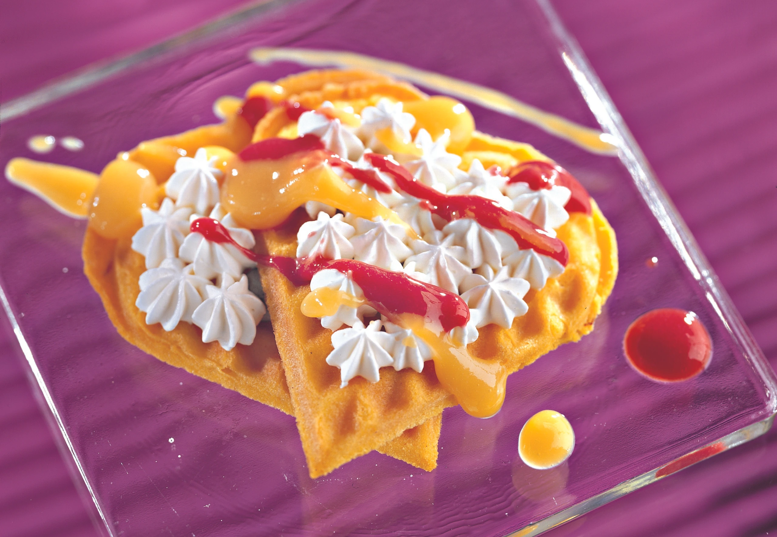 Creme mit einem Dressiersack mit Sterntülle auf die Waffeln dressieren. Waffeln mit Fruchtsaucen (siehe Tipp) garnieren.