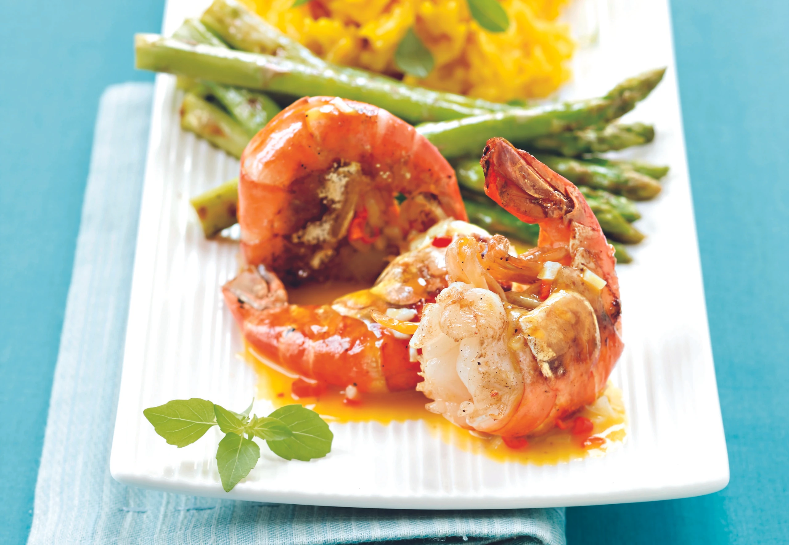 Grillpfanne erhitzen, Garnelen und Spargel darin braten. Orangensaft mit übrigem Knoblauch und Chili aufkochen, Butter einrühren. Risotto mit Garnelen, Spargel, Sauce und übrigem Basilikum servieren.