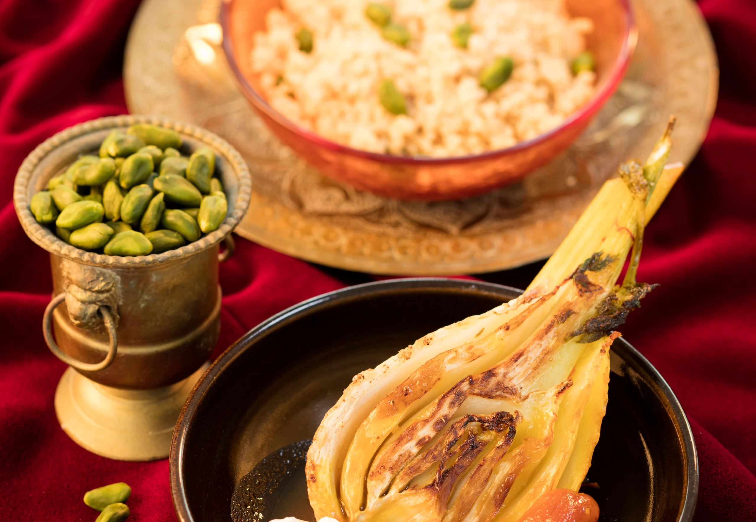 Für den Couscous Wasser mit Salz und 1 TL Zimt aufkochen.Couscous einrühren und zugedeckt ca. 10 Minuten quellen lassen. Pistazien unterrühren. Fenchel mit Schmorfond, Joghurt und Couscous servieren.