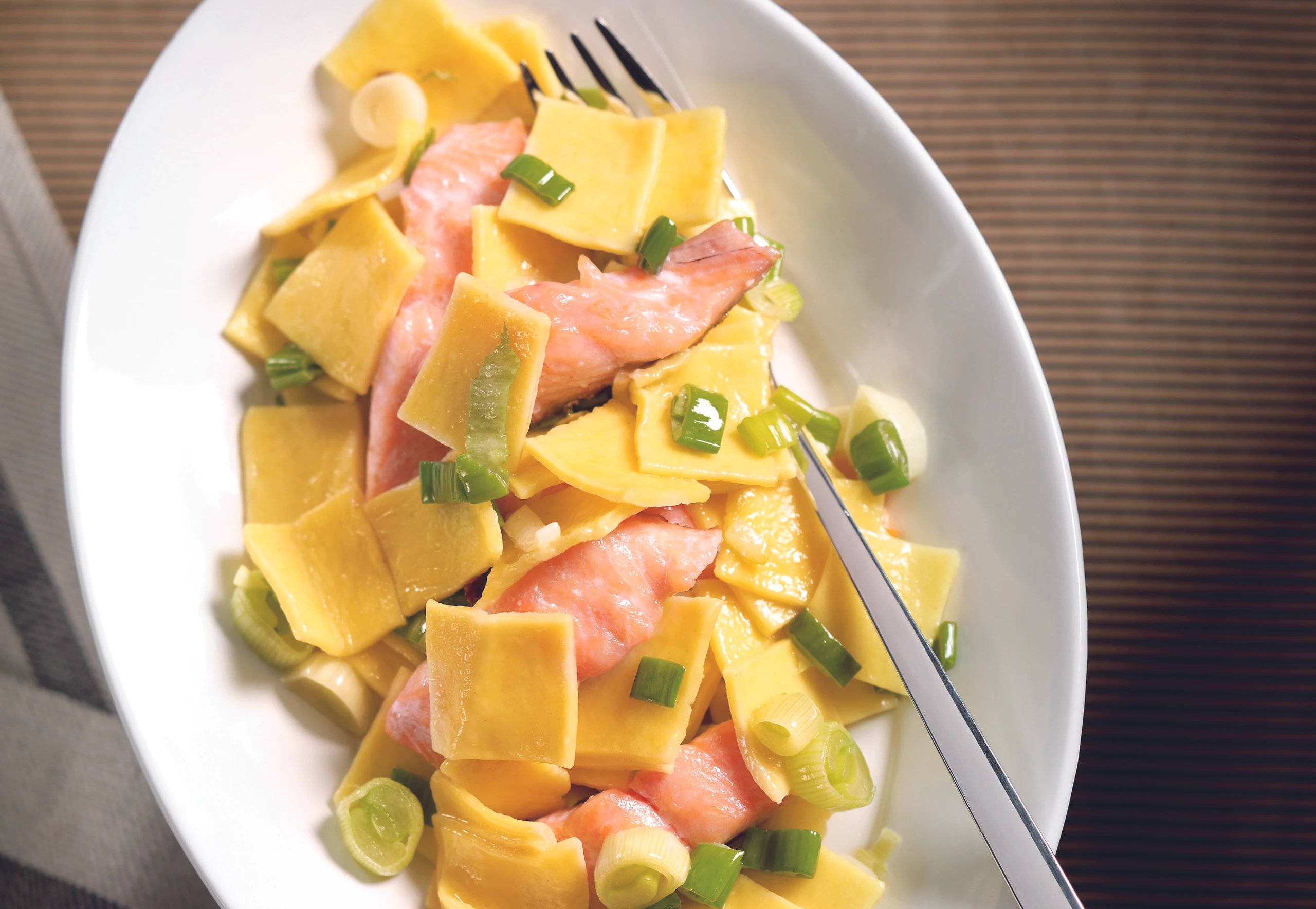 Teig in Fleckerl (ca. 3 x 3 cm) schneiden. Salzwasser aufkochen, Fleckerl einlegen und bissfest kochen (dauert ca. 1 Minute). Fleckerl abseihen, mit heißem Wasser abspülen und abtropfen lassen. Fleckerl, Jungzwiebelmischung und Forellenfilets behutsam vermischen, mit Salz und Pfeffer würzen.