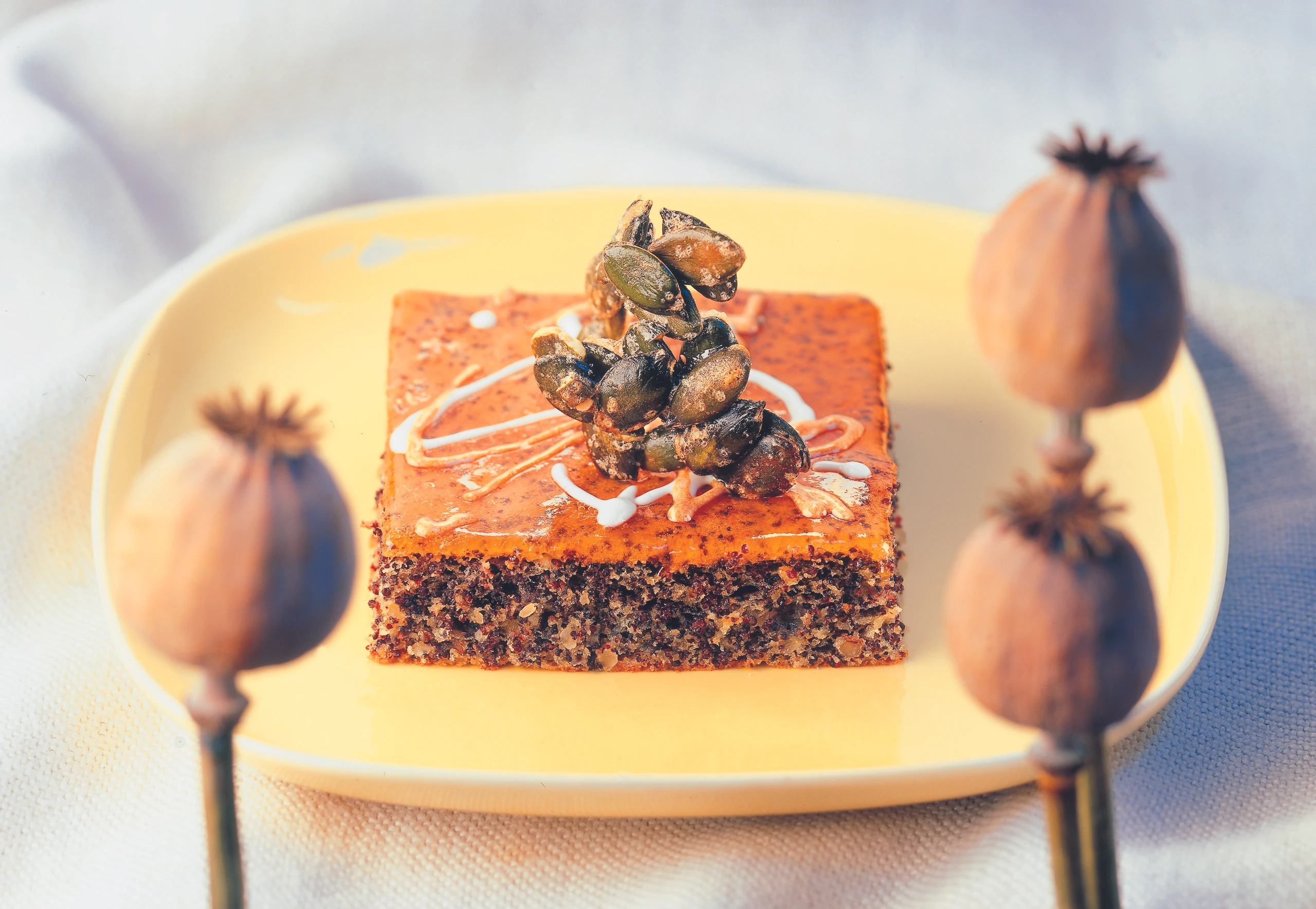 Marmelade aufkochen, gleichmäßig auf dem Kuchen verstreichen. Sauerrahm mit Staubzucker verrühren, die Hälfte davon mit Kürbiskernöl vermischen. Beide Rahmsaucen in kleine Papierstanitzel oder Plastiksackerln füllen, die Spitzen knapp abschneiden und den Kuchen damit dekorieren. Kuchen zusätzlich mit Kürbiskernplätzchen garnieren.