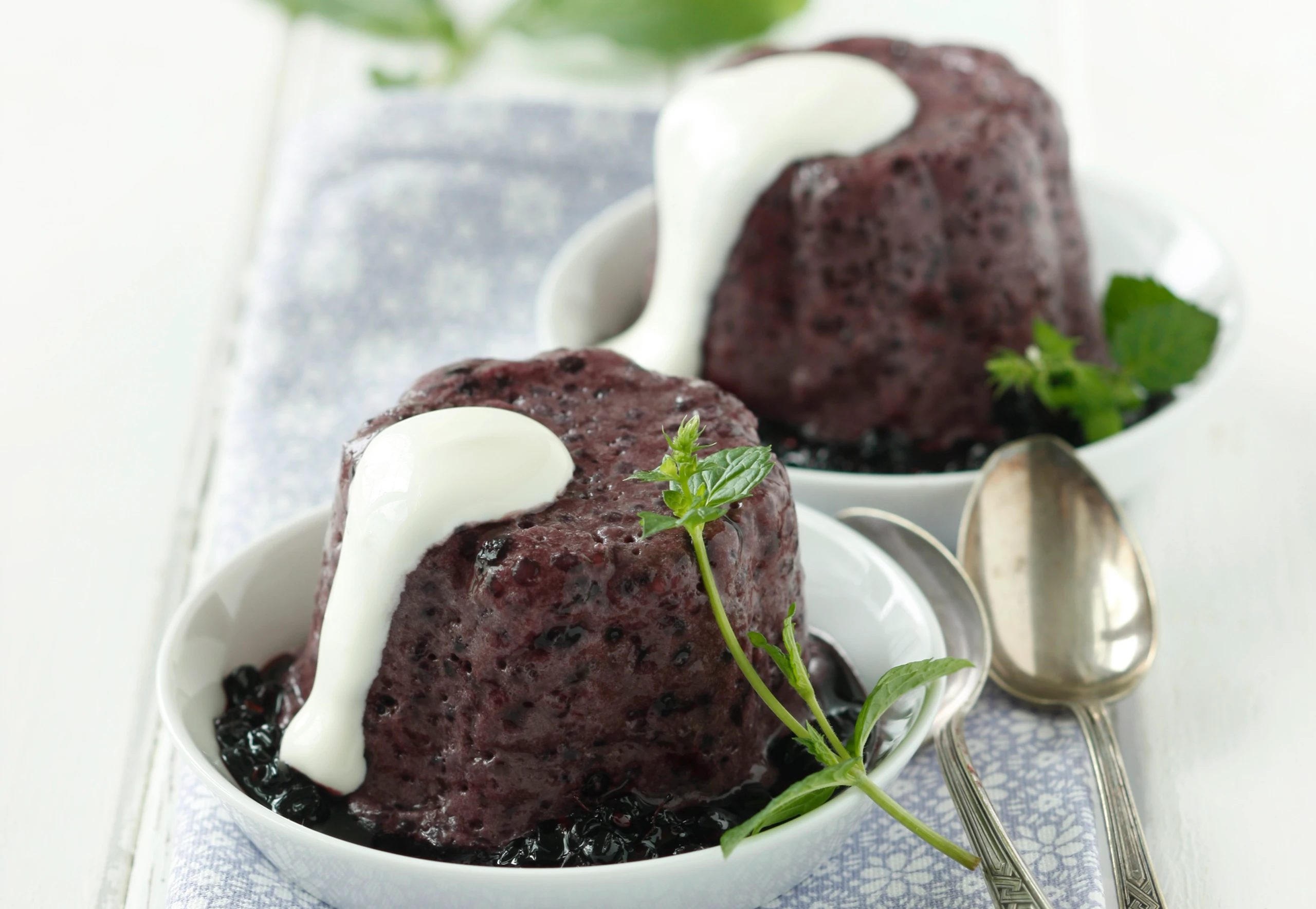 Holler-Kompott auf Tellern anrichten. Förmchen kurz in heißes Wasser stellen, Puddings auf das Kompott stürzen. Eventuell mit Sauerrahm und Minze garniert servieren.