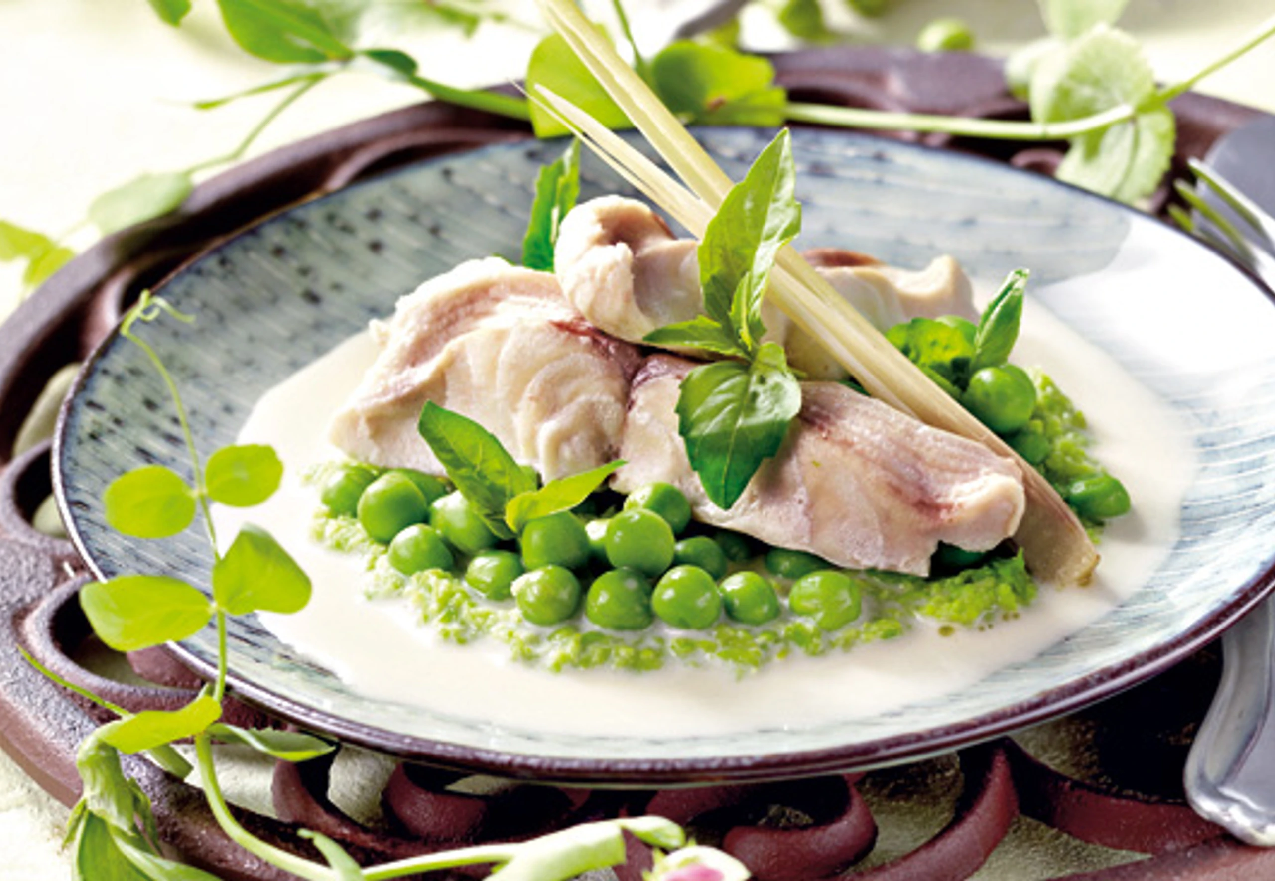 Restliche Erbsen in übriger Butter und 1 EL Wasser bissfest dünsten. Fischfilets mit Püree, Erbsen und Kokossauce anrichten, mit Basilikum und Zitronengras garnieren.