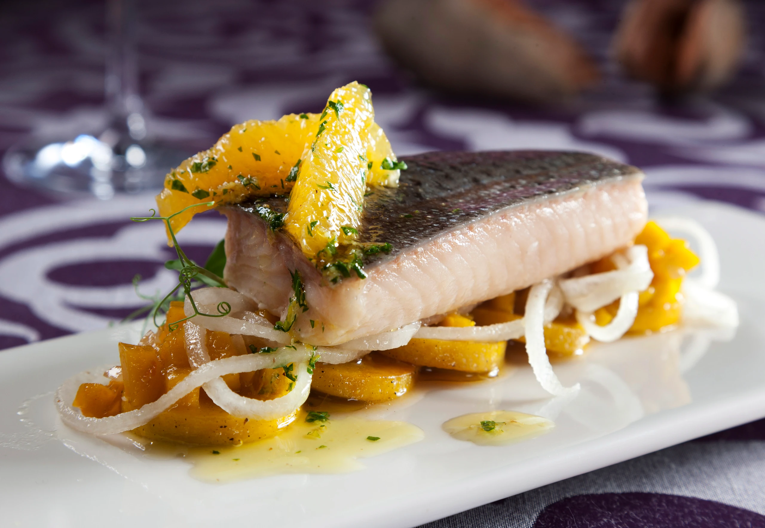 Für die Garnitur Orange so schälen, dass auch die weiße Innenhaut entfernt wird. Filets zwischen den Trennhäuten herausschneiden. Öl erwärmen, Zitronenschale, Orangenfilets und Petersilie untermischen, mit Salz und Pfeffer würzen. Rettich schälen, in feine Streifen schneiden, mit Zucker, Salz und Pfeffer würzen.