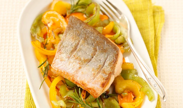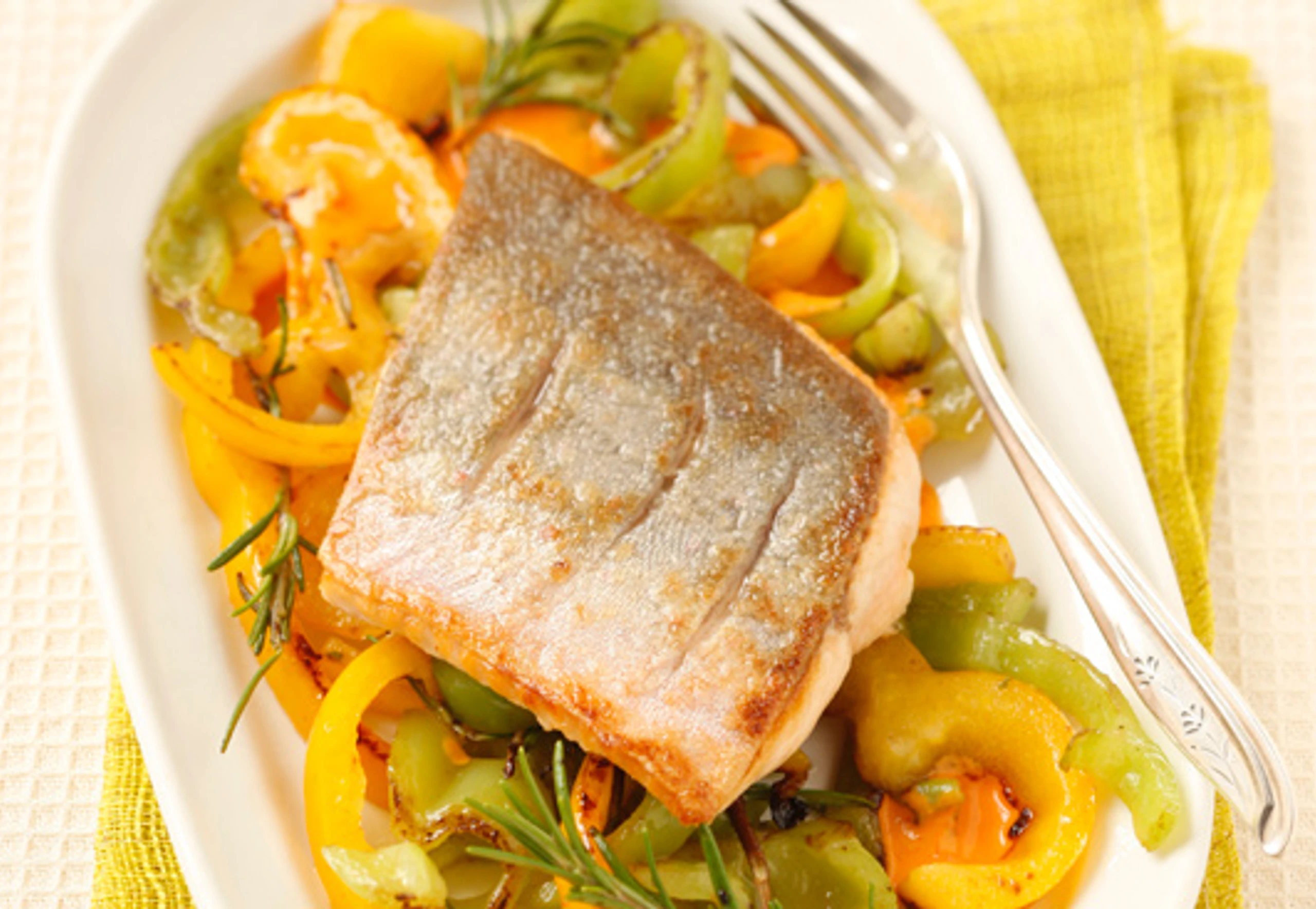 Rohr auf 80°C vorheizen. Fischfilet halbieren und auf der Hautseite quer einschneiden. Paprika putzen und in 2 cm breite Streifen schneiden.