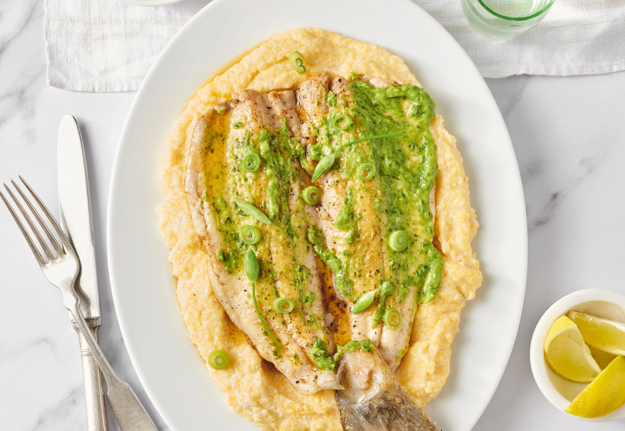 Saibling mit Bärlauch-Salsa-Verde und Zitronenpolenta