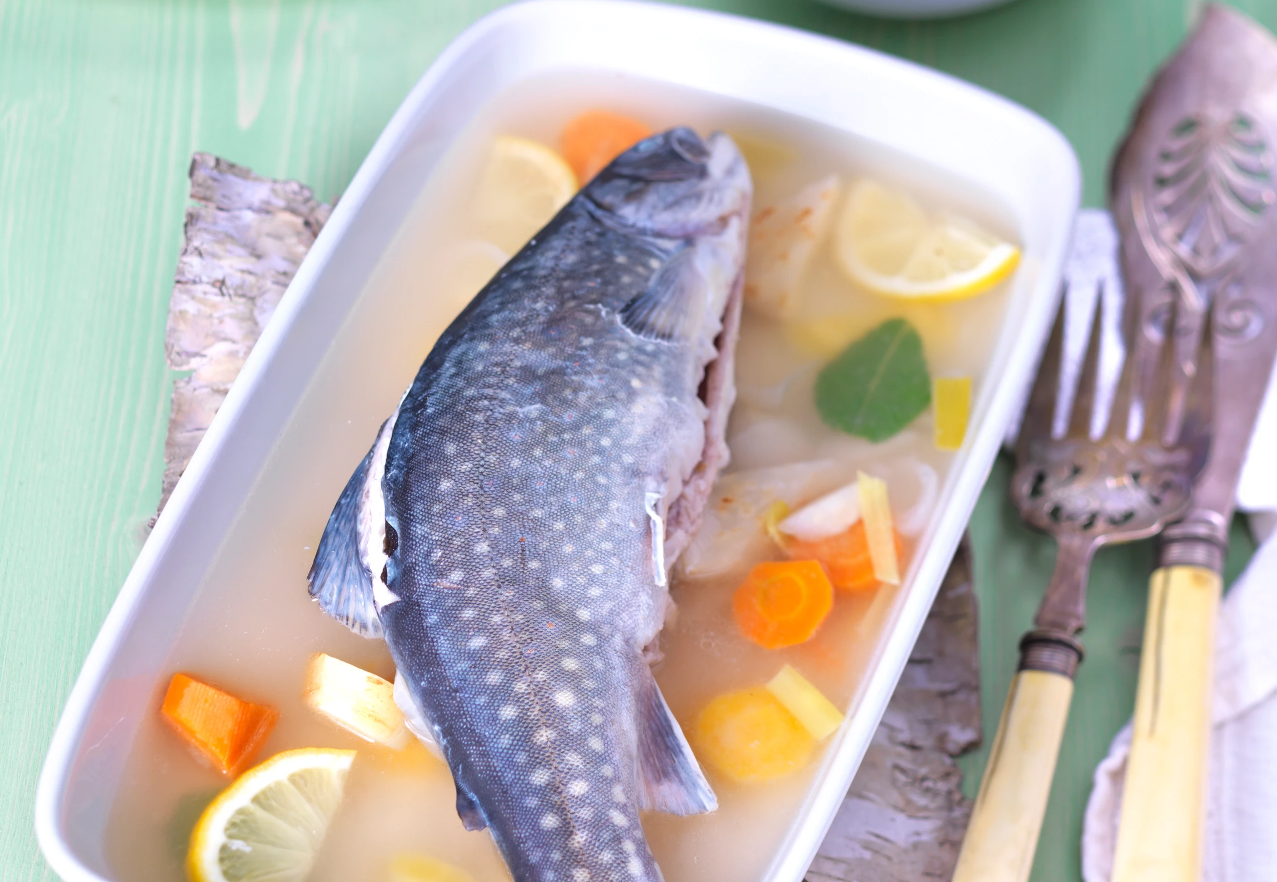 Saiblinge innen und außen mit Salz, Pfeffer und Zitronensaft würzen. Schalotten und Suppengrün schälen. Schalotten und Zitrone in Scheiben, Suppengrün klein schneiden. Wasser, Wein, Schalotten, Suppengrün, Lorbeer, Wacholder und wenig Salz aufkochen. Saiblinge in den Fond legen und unter dem Siedepunkt gar ziehen lassen (ca. 15 Minuten).