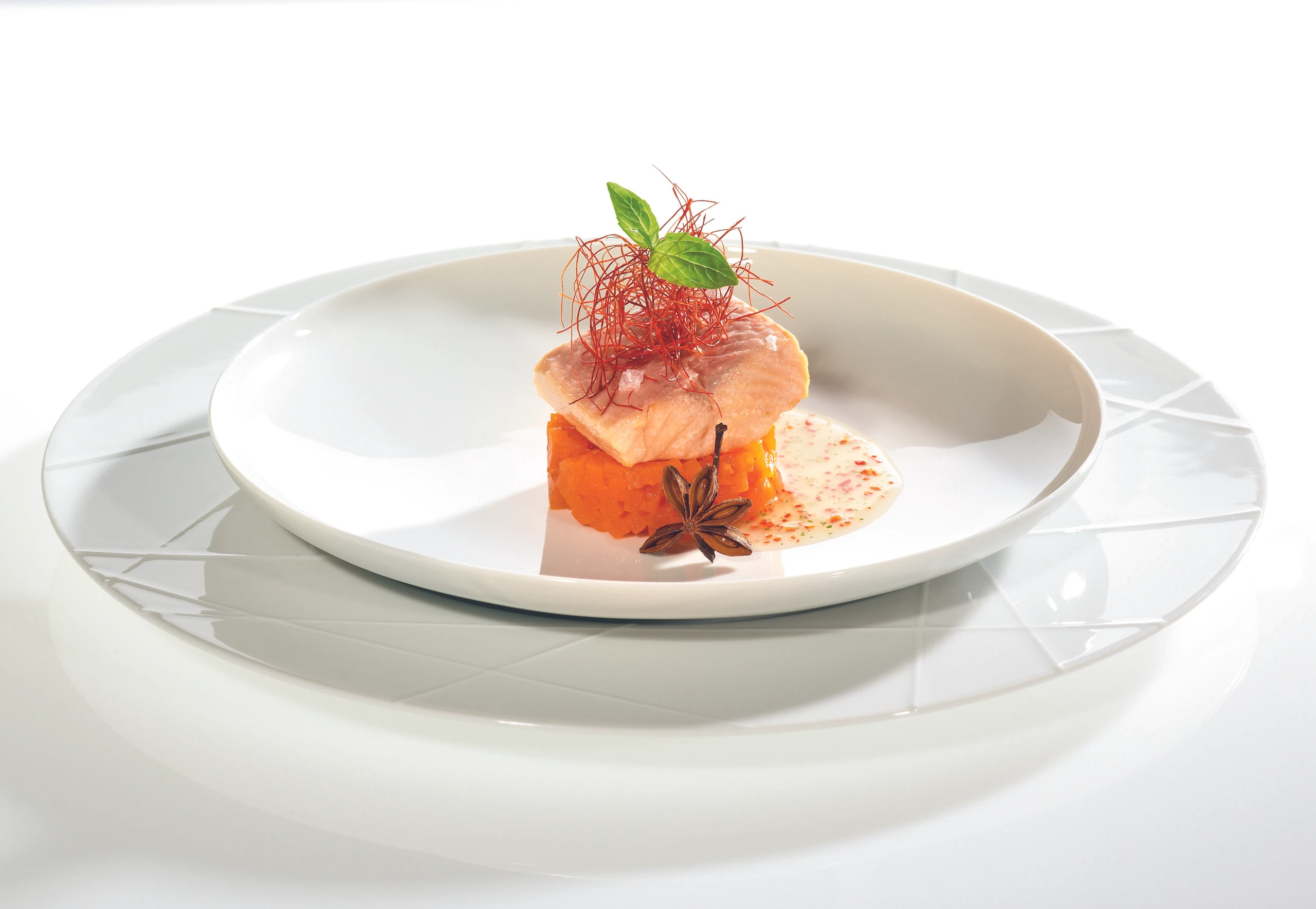 Anrichten: Kürbischutney mit Hilfe eines Ringes auf Tellern platzieren, Saiblingsfilets darauflegen. Mit der Vinaigrette anrichten, mit Chilifäden, Basilikumblättchen und Sternanis garnieren.