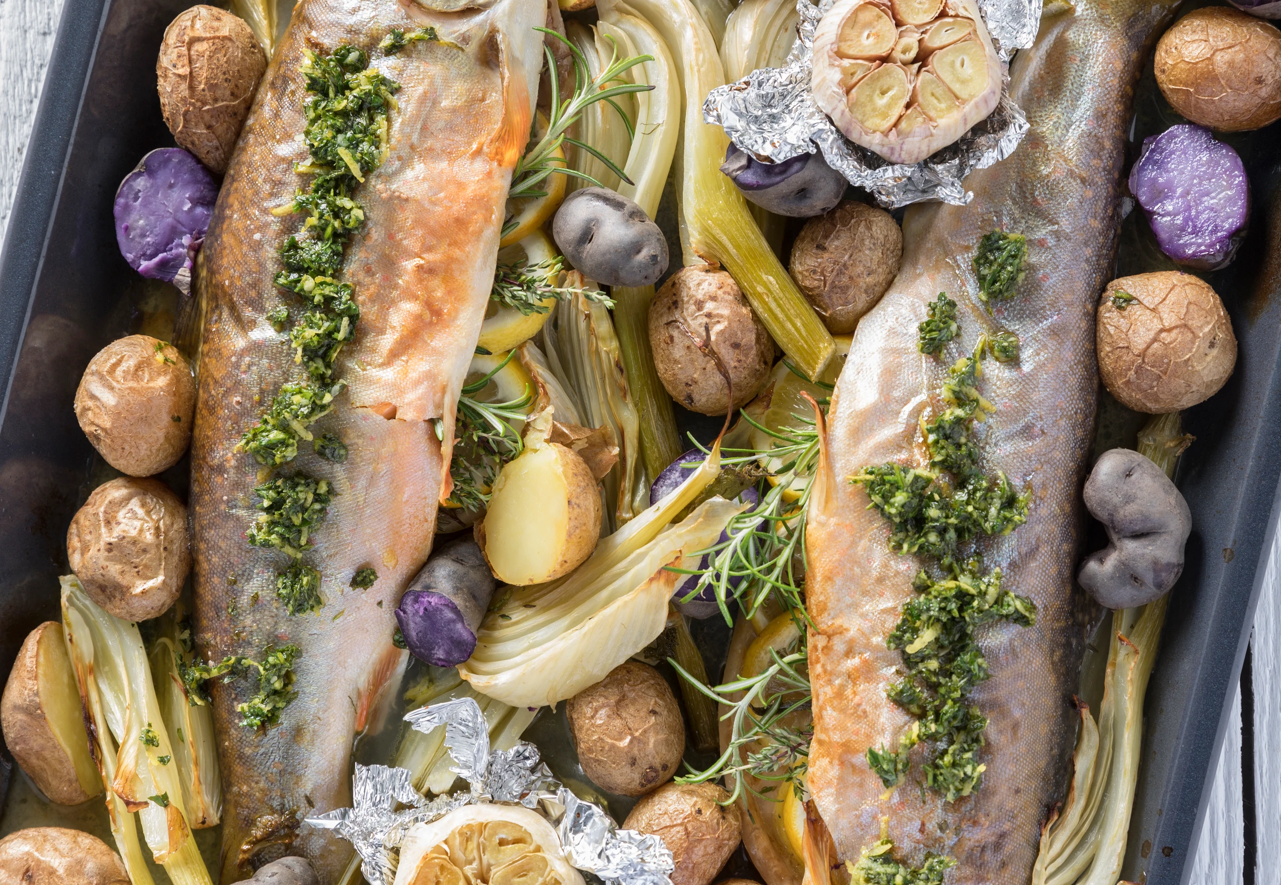 Rohr auf 200°C vorheizen. Saiblinge innen und außen gründlich waschen, trockentupfen und kräftig salzen und pfeffern. Zitronen in Scheiben schneiden. Saiblinge mit Zitronenscheiben, Rosmarin und Thymian füllen. Fenchel putzen, in Spalten schneiden und auf dem Blech verteilen. Saibling darauf legen. Erdäpfel waschen, auf das Blech legen, mit Olivenöl beträufeln und den Wein zugießen. Im Rohr (mittlere Schiene) ca. 50 Minuten garen.