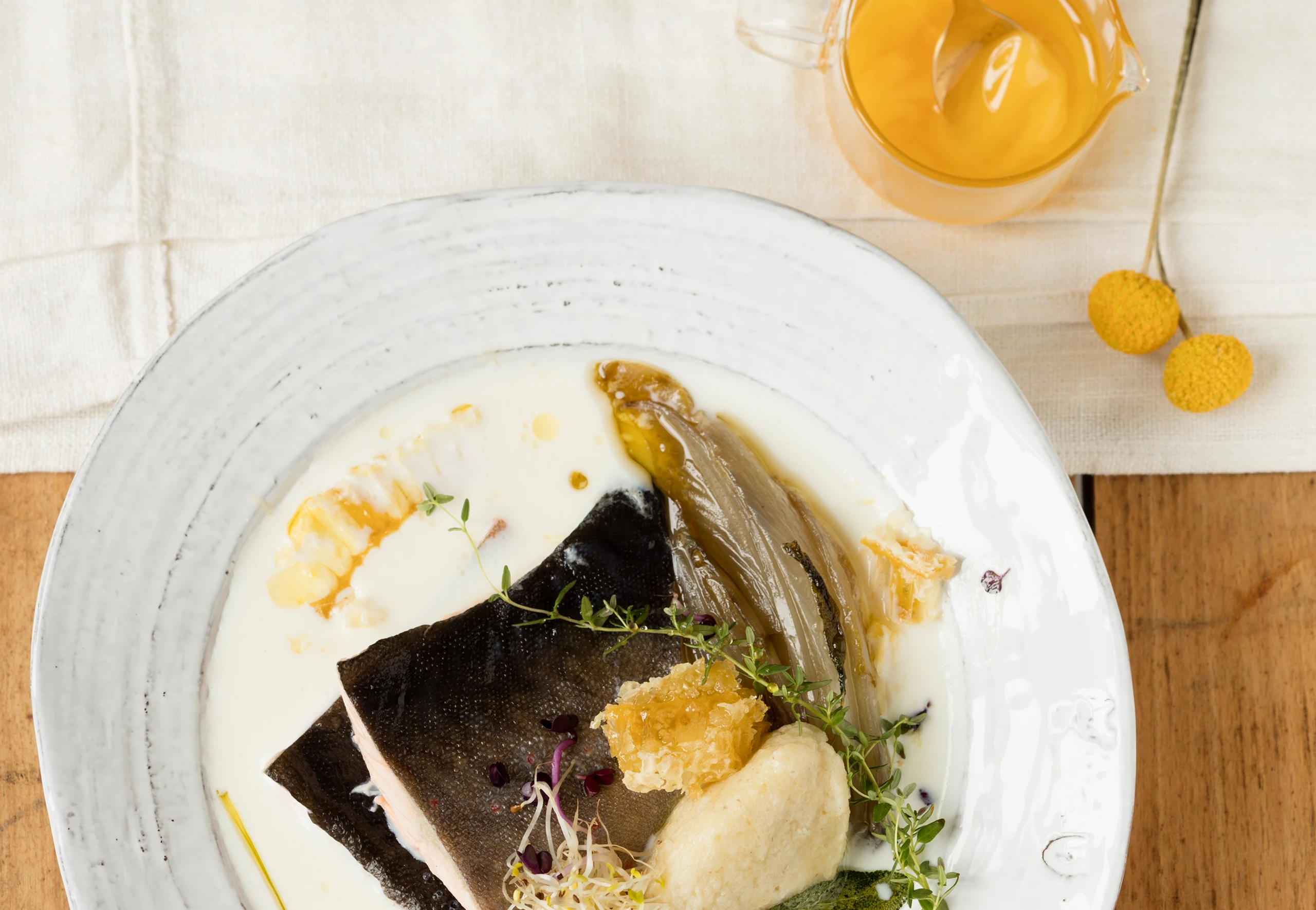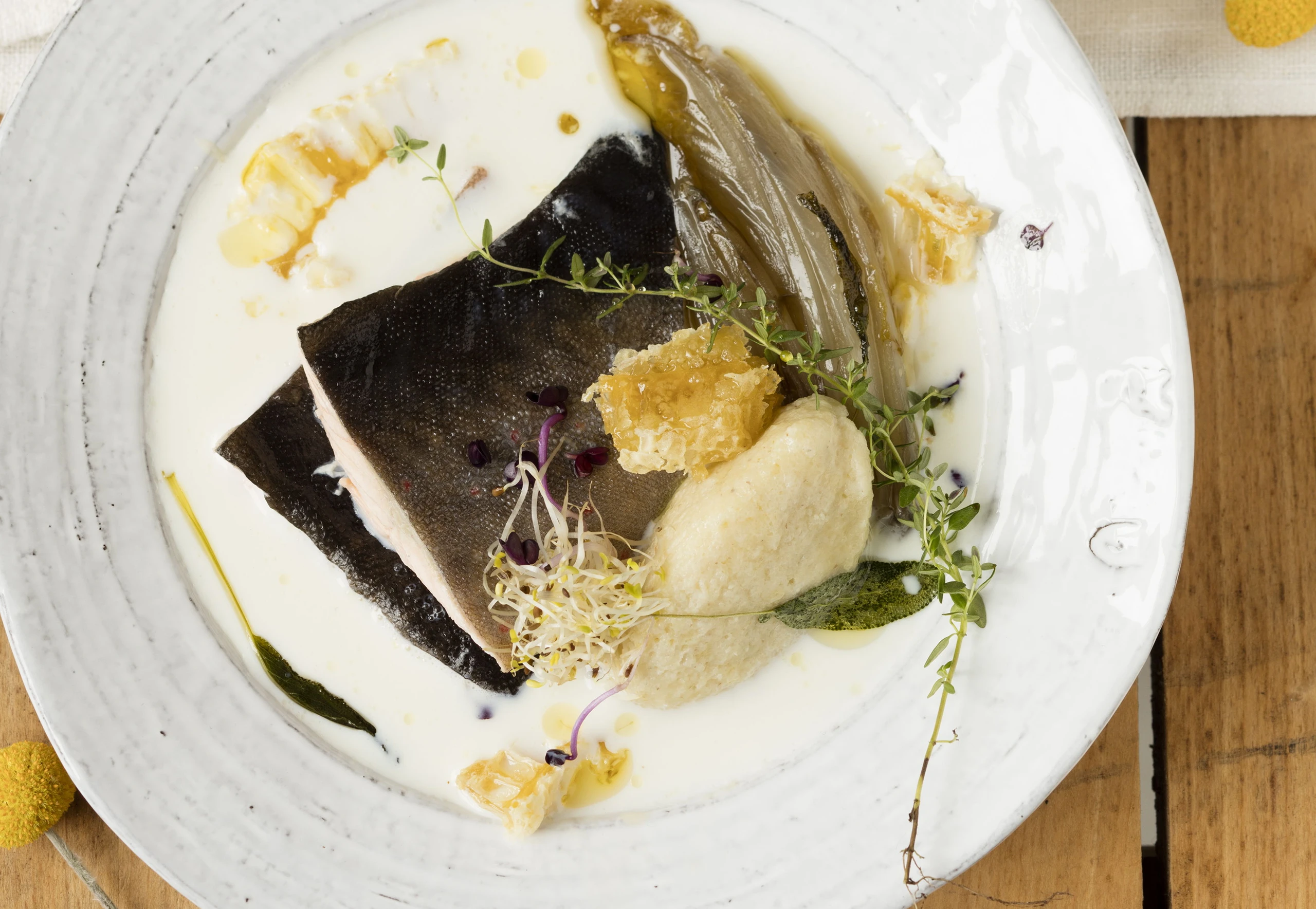 - Fisch aus der Honigmilch und Nockerln aus dem Kochwasser heben. Fisch mit 2 EL von der Honigmilch, Chicorées und Grießnockerln anrichten. Honigwabe in kleine Stücke schneiden. Saibling mit Honigwabe und Thymian garnieren, eventuell mit Blütenpollen bestreuen.