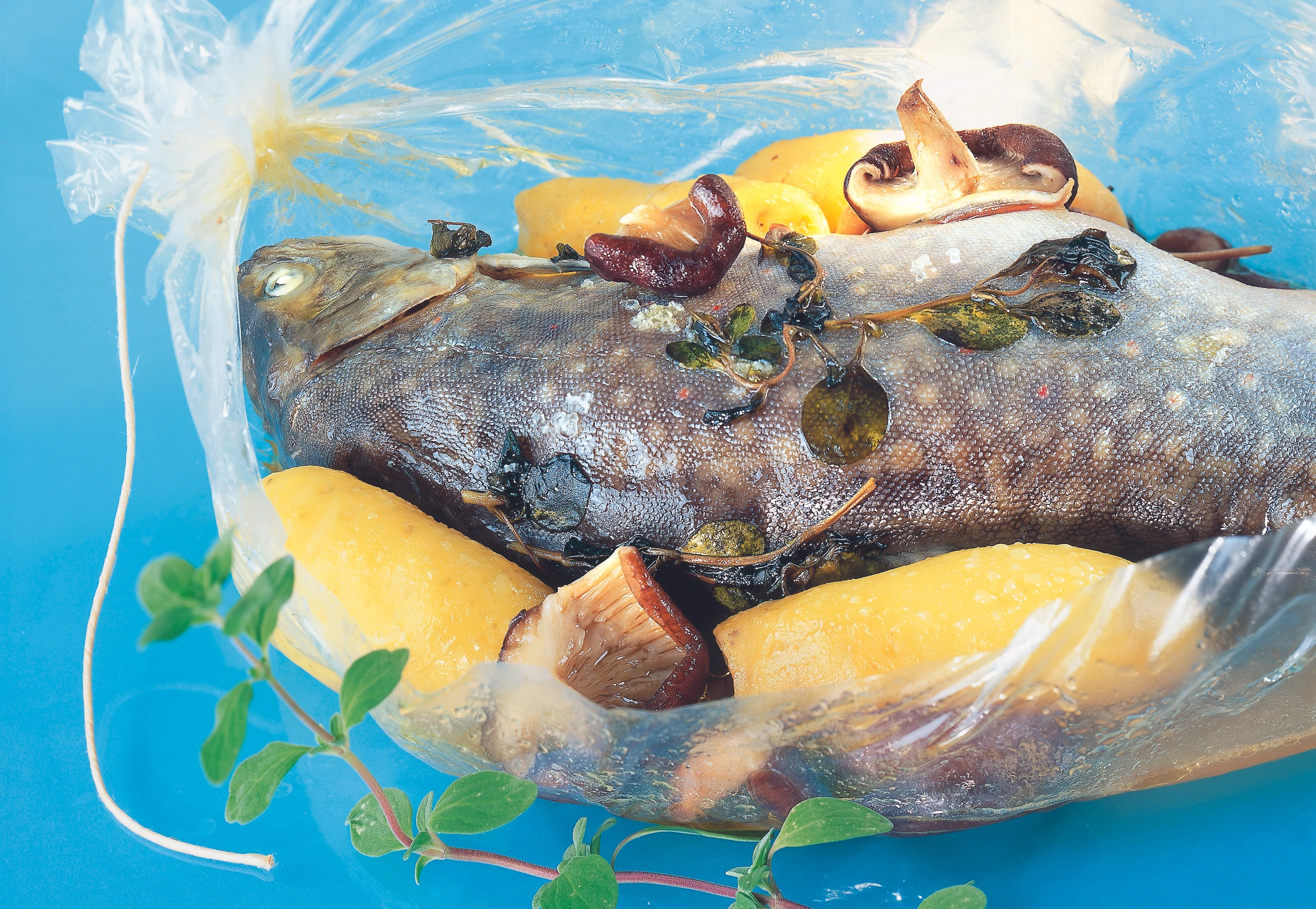 Saiblinge mit Meersalz bestreuen, mit Olivenöl beträufeln und in die Folie legen. Saiblinge mit Majoran belegen, Erdäpfel und Pilze in die Folie geben, Folie an beiden Enden mit Spagat verschließen.