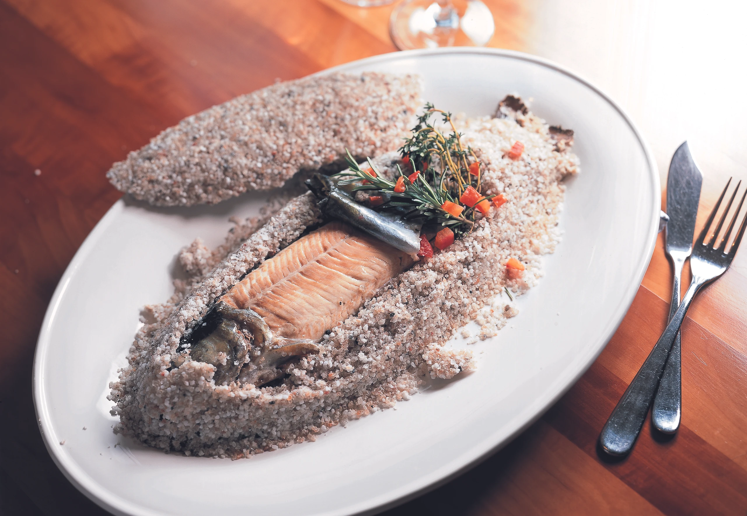 Von der Salzschicht einen Deckel aufschneiden und abheben. Haut vom Fisch abziehen, Filets von den Gräten lösen und anrichten. Dazu passen Petersilkartoffeln und grüner Salat.