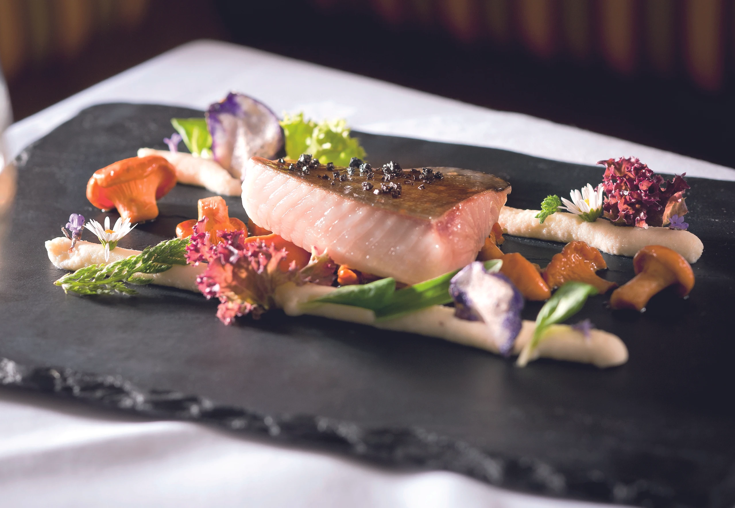 - Erdäpfelcreme erwärmen, in einen Dressiersack mit glatter Tülle füllen und streifenförmig auf die Teller dressieren. Fisch-filets aus dem Rohr nehmen, Folie entfernen. Schwammerln und Fischfilets auf die Teller geben, mit Salat und Kräutern garniert servieren.