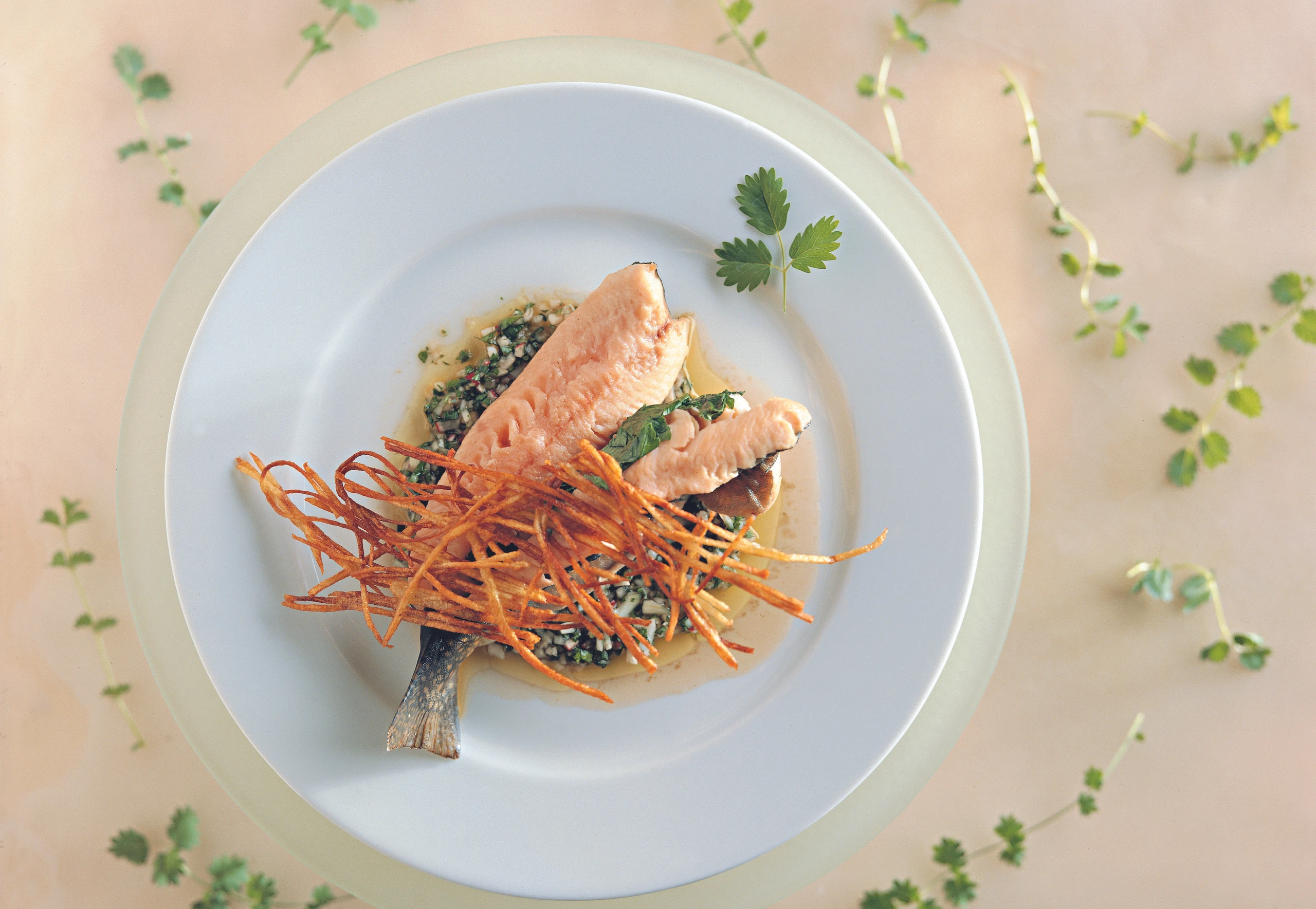 Filets mit einer Palette vorsichtig aus der Pfanne heben und mit der Kräutermarinade und den gebackenen Erdäpfelstreifen (siehe Rezept) anrichten und rasch servieren.