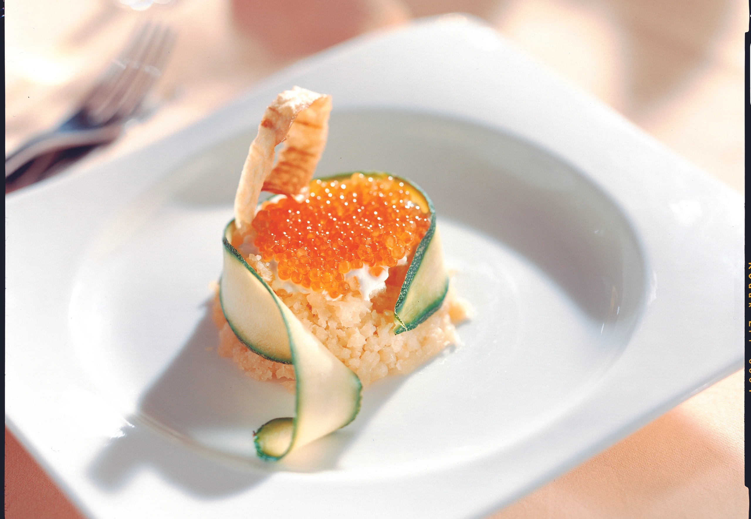 Zucchini mit dem Sparschäler in dünne Streifen schneiden und um die Törtchen legen. Rahm verrühren. Butter erhitzen, bis sie hellbraun ist und über die Erdäpfel gießen. Rahm und Kaviar darauf verteilen. Dazu passen Gemüsechips – Gemüse mit dem Sparschäler in dünne Scheiben schneiden und in Öl schwimmend knusprig backen.