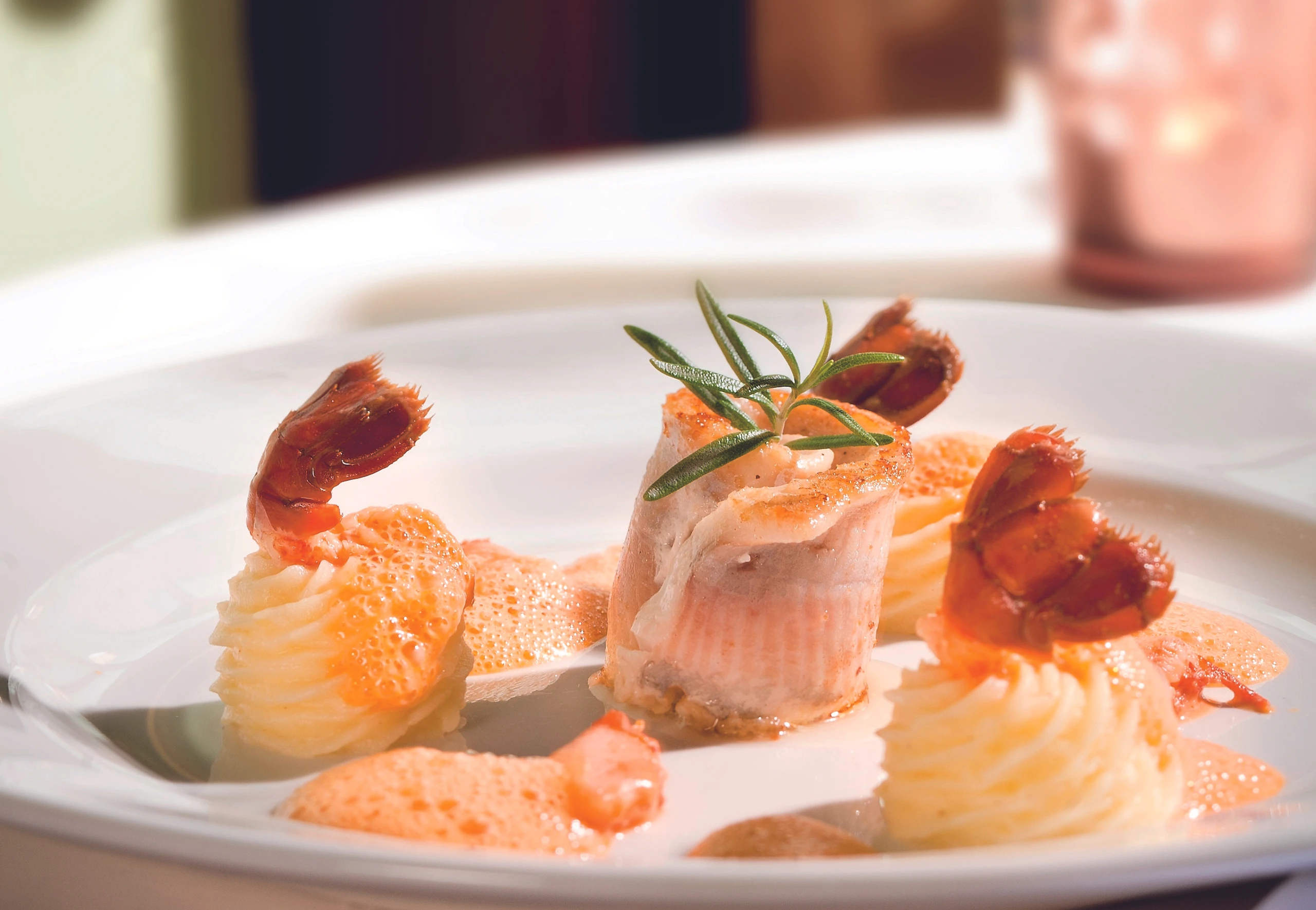 Für das Püree Milch mit Butter aufkochen und mit einem Stabmixer aufschlagen, Erdäpfel unterrühren, mit Salz und Muskat würzen. Püree in einen Dressiersack (Sterntülle) füllen, auf die Teller dressieren und mit den Krebsschwänzen garnieren. Übrige Sauce aufmixen. Saiblingsröllchen mit Rosmarin garnieren, mit der Sauce und dem Scherenfleisch anrichten.