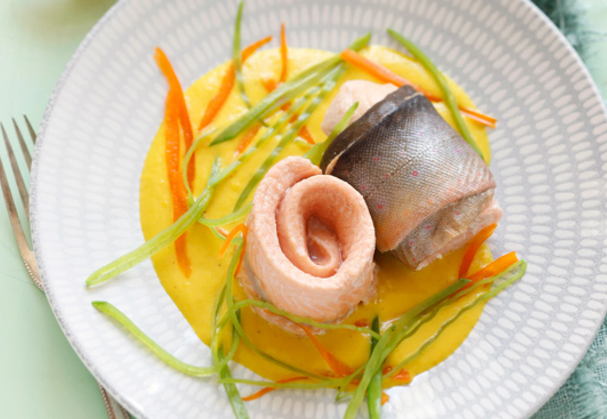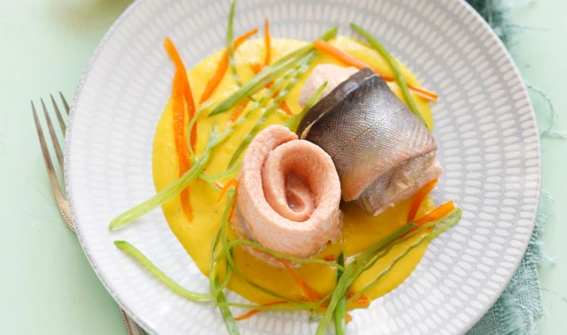 - Orangen Paprika und Erbsenschoten in Salzwasser blanchieren. Filets auf der Creme anrichten, mit Gemüse servieren.