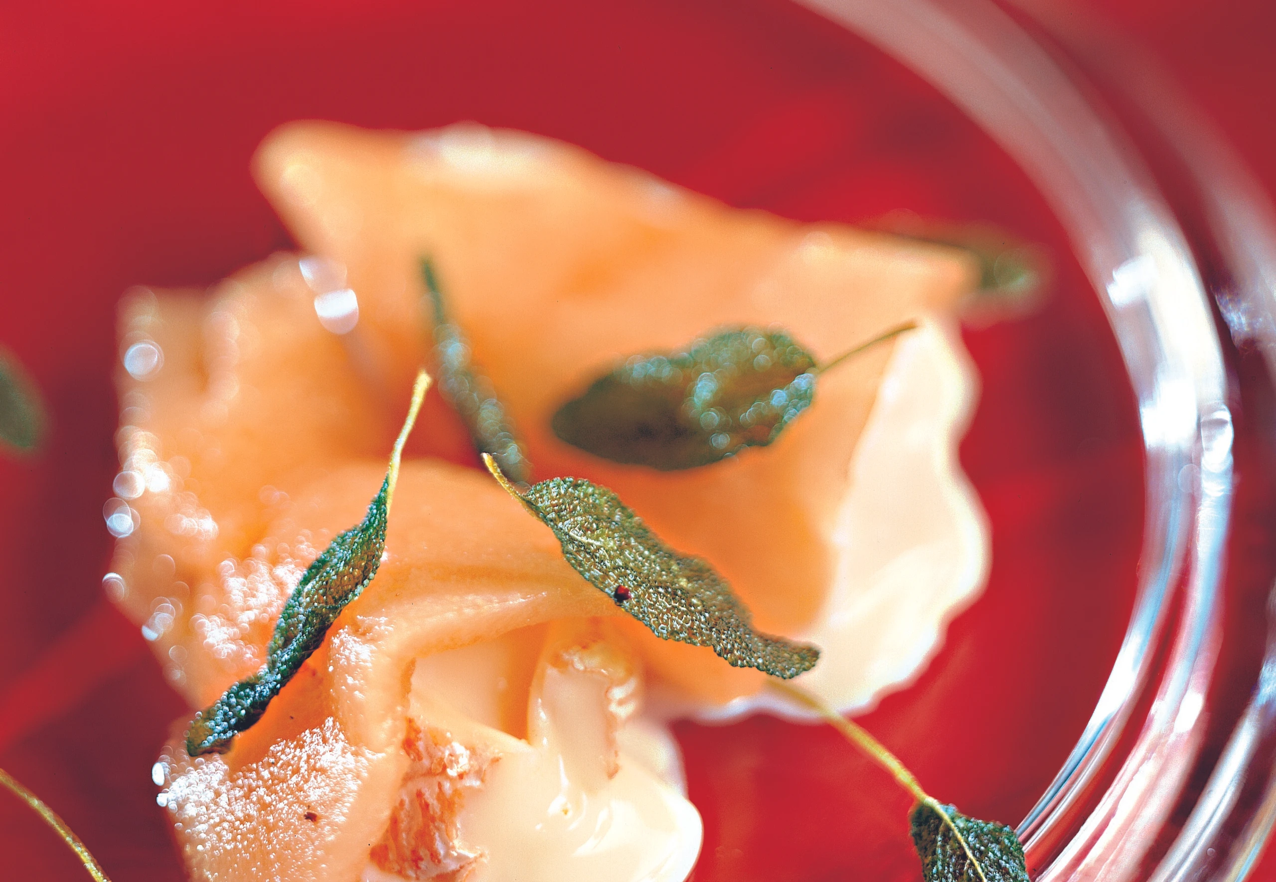 Salbei in aufgeschäumter Butter kurz knusprig braten, auf Küchenpapier abtropfen lassen und über die Käse-Häppchen streuen.