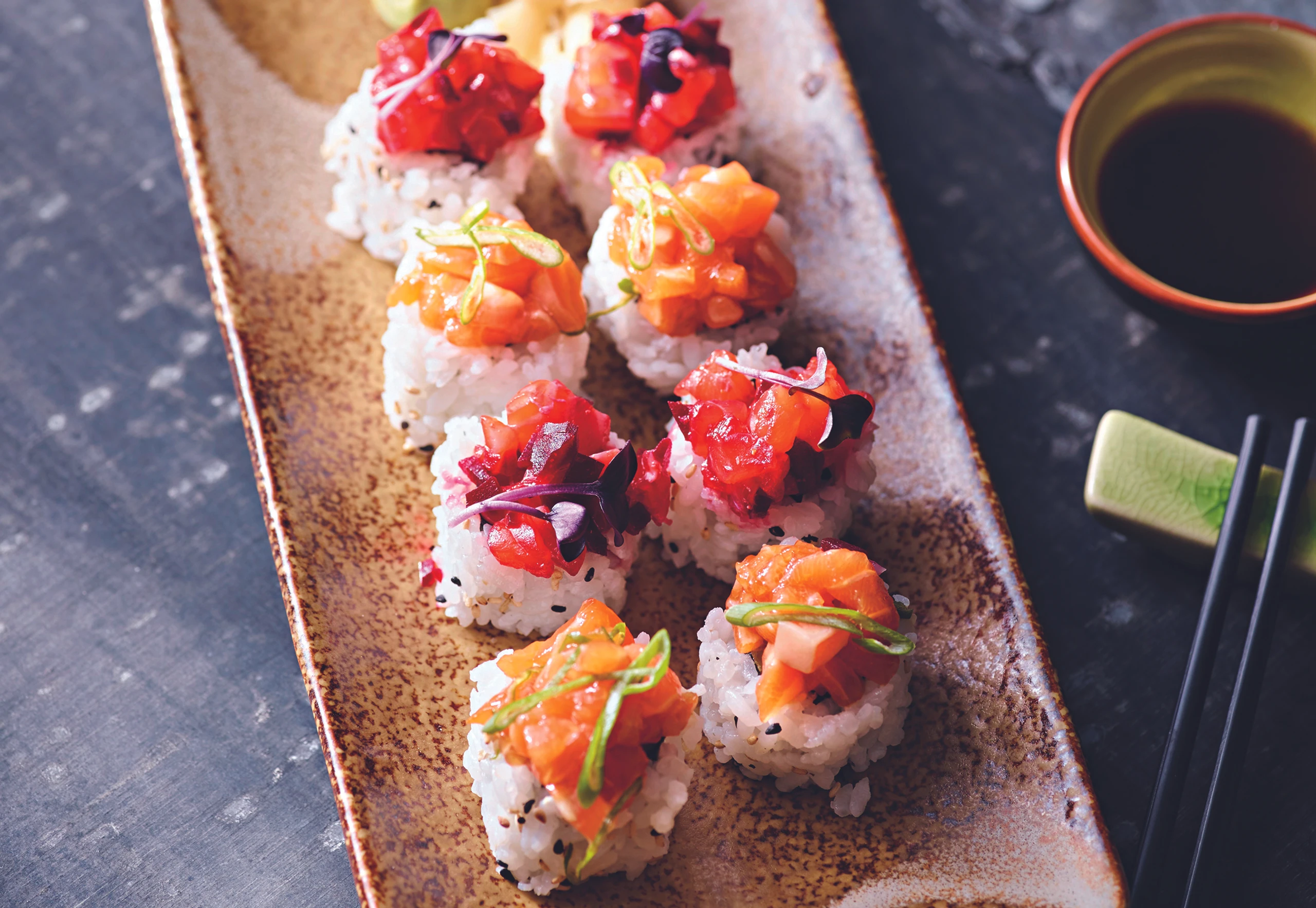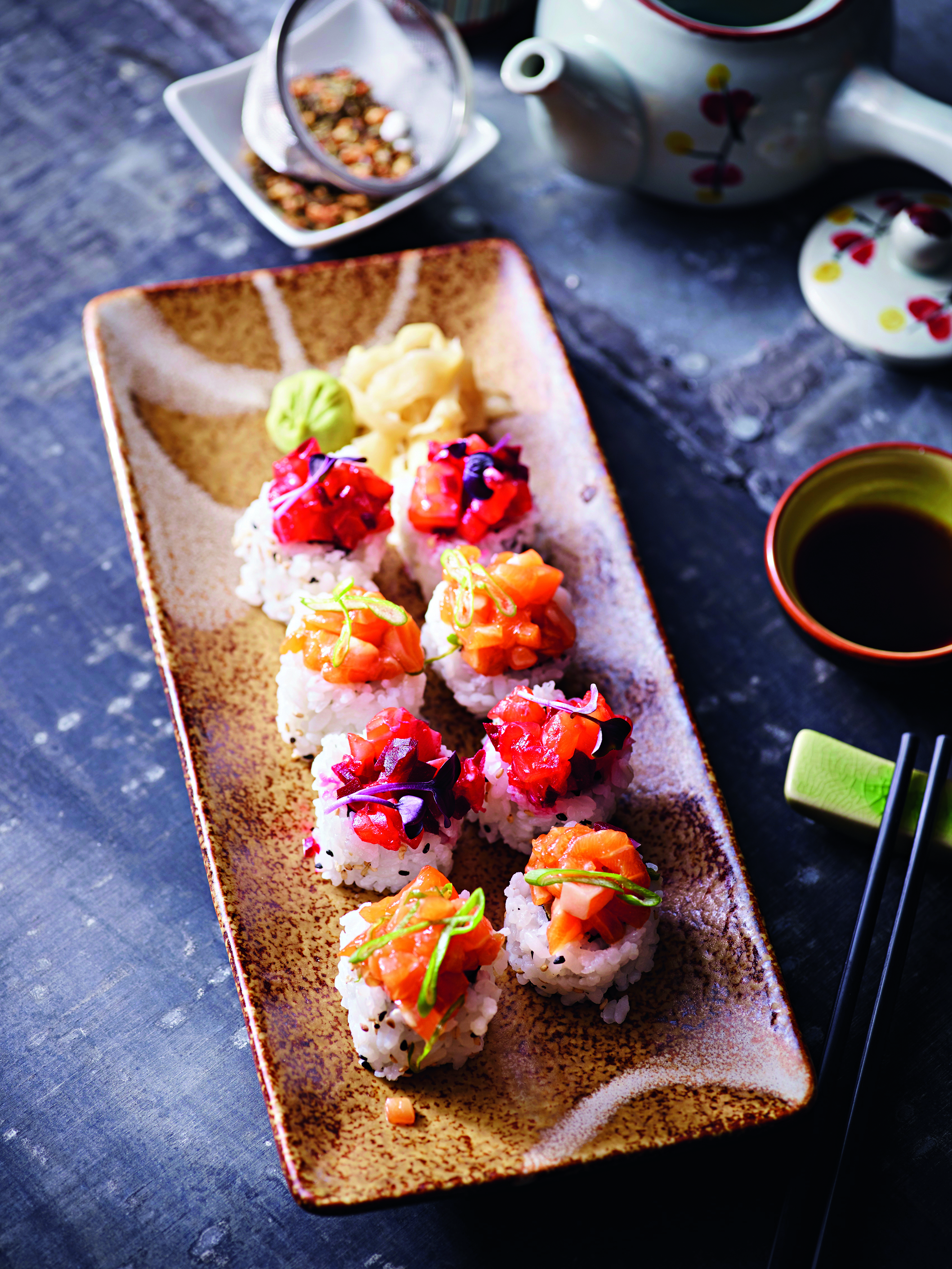 Rollen mit einem scharfen Messer in je 8 Scheiben schneiden und anrichten. Die Hälfte mit Rüben-Lachs-Tatar und Kresse belegen, die andere mit Zwiebel-Lachs-Tatar und -grün. Mit Sushi-Ingwer, Wasabi und Sojasauce servieren.