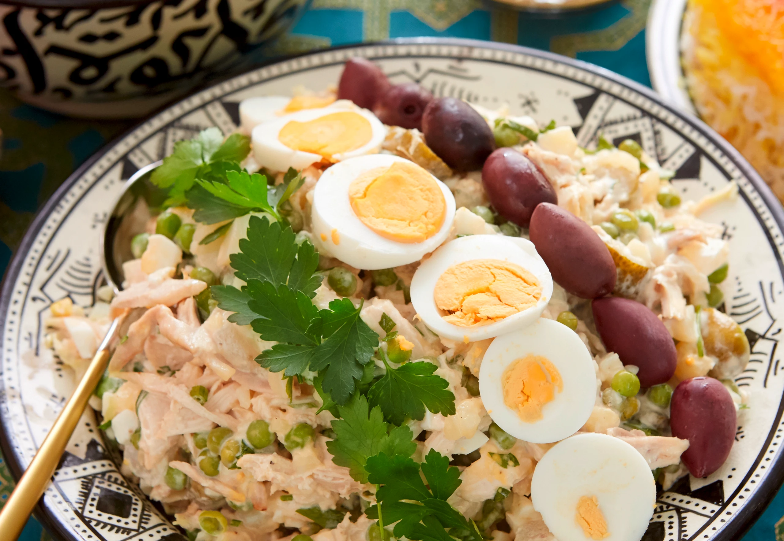 Erdäpfel weich kochen, schälen und klein würfelig schneiden. Petersilblättchen fein hacken. Eier hart kochen, mit kaltem Wasser abschrecken und schälen. 1 Ei für die Deko in Scheiben schneiden, übrige würfelig schneiden. Paradeiser klein würfeln. Erbsen blanchieren und kalt abschrecken. Fleisch vom Huhn lösen, zerzupfen und mit allen Zutaten verrühren. Mit Eischeiben, Oliven und Petersilie garnieren.