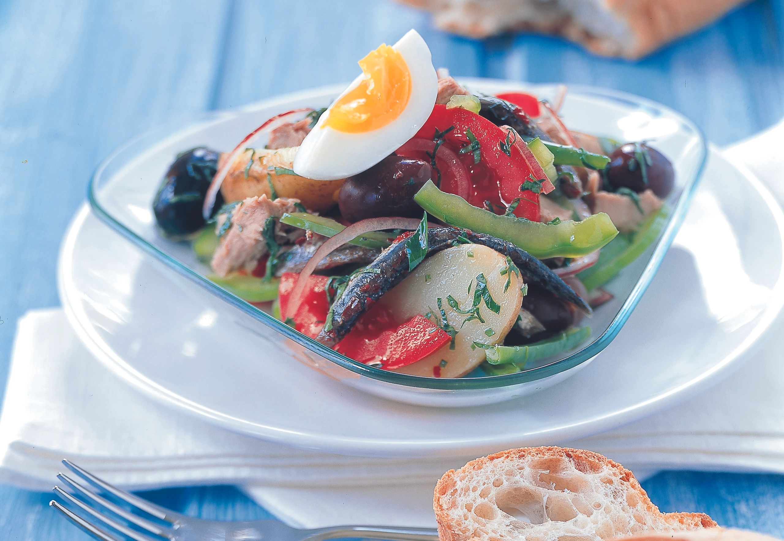 Essig mit Wasser, Salz und Pfeffer verrühren, Olivenöl unter Rühren zugießen. Marinade über den Salat gießen, 10 Minuten ziehen lassen. Salat vor dem Anrichten mit Petersilie vermischen, mit Oliven, Ei und Sardellenfilets garnieren.