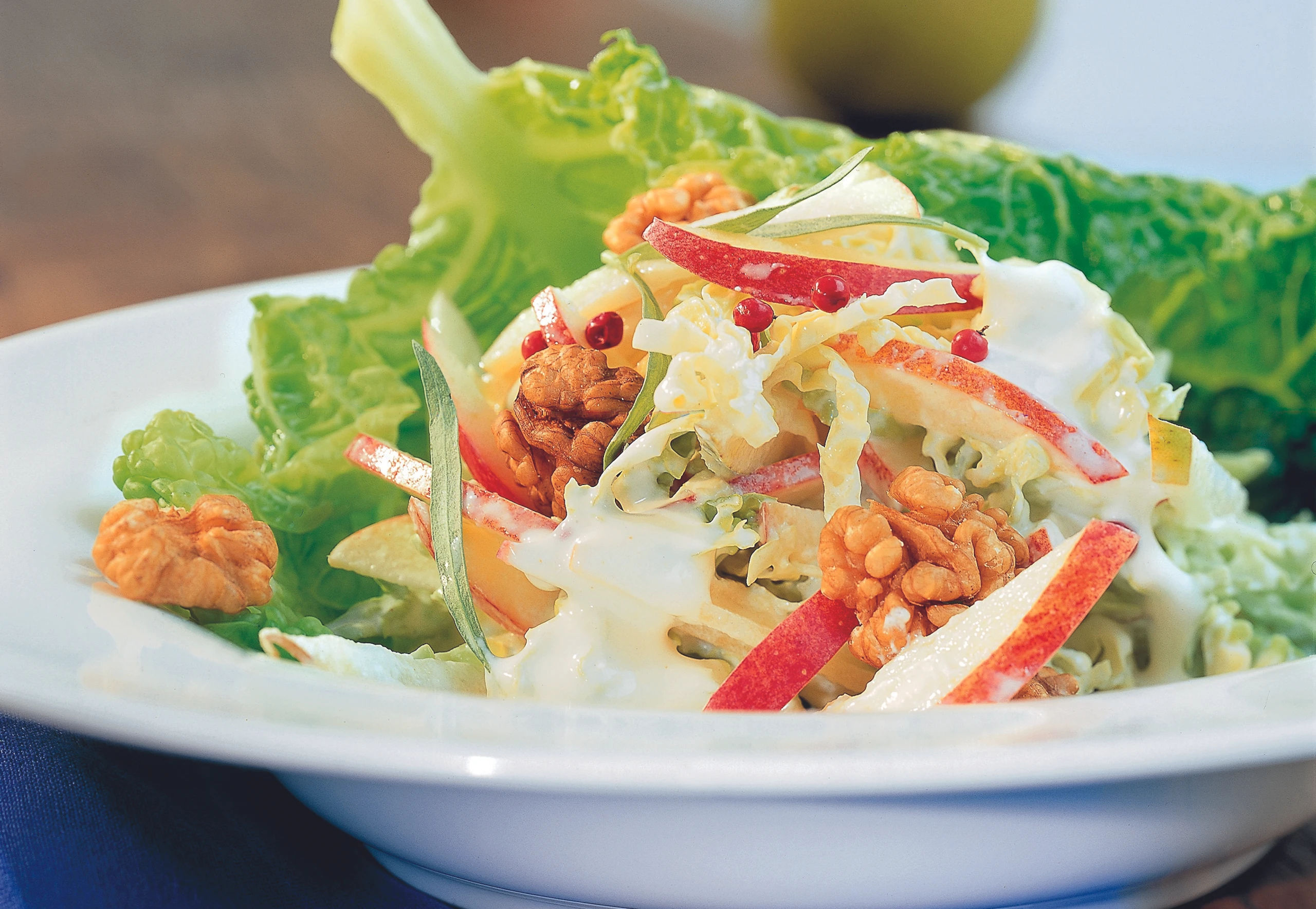 Nüsse in einer trockenen Pfanne rösten bis sie angenehm riechen. Salat mit Nüssen, Pfefferkörnern und Estragon garnieren.