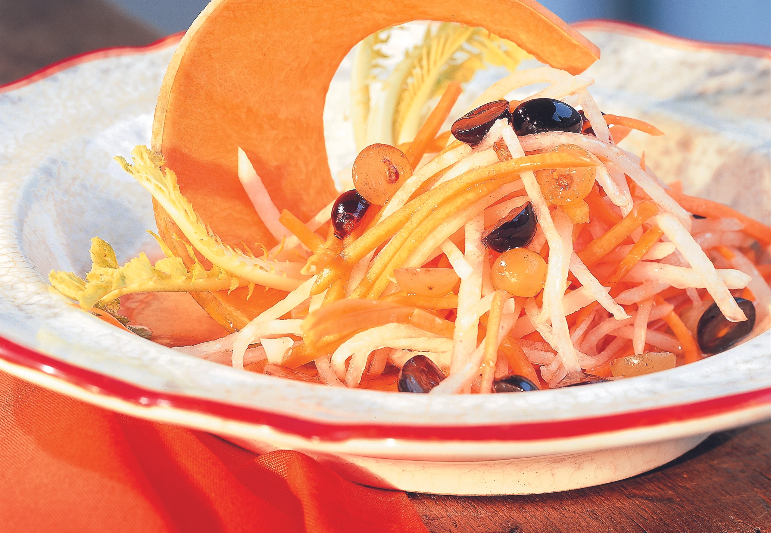 Vom Kürbis 4 dünne Scheiben als Garnitur herunterschneiden. Restlichen Kürbis und Rübe in feine Streifen schneiden oder hobeln. Die Streifen mit der Marinade vermischen und mit Kürbisscheiben und Friseesalat anrichten.