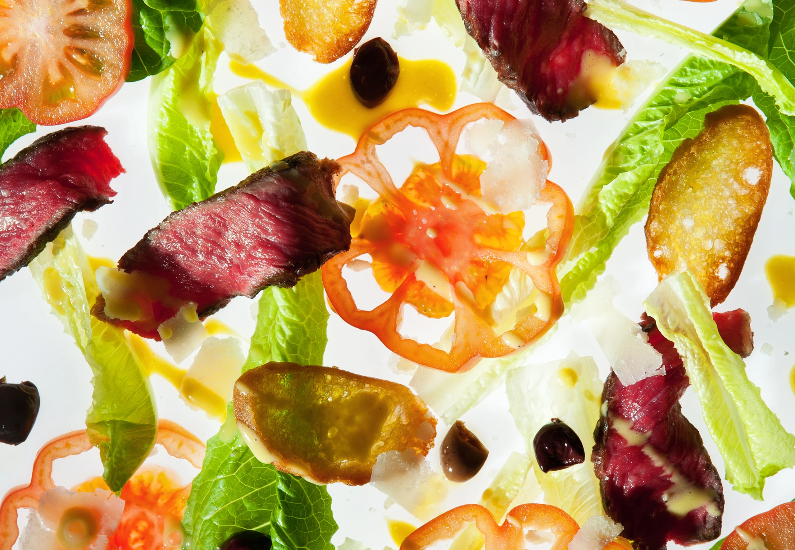 Fleisch quer in dünne Scheiben schneiden. Salat, Paradeiser und Oliven vermischen, mit dem Fleisch anrichten, mit der Marinade beträufeln und mit den Brotscheiben garniert servieren.