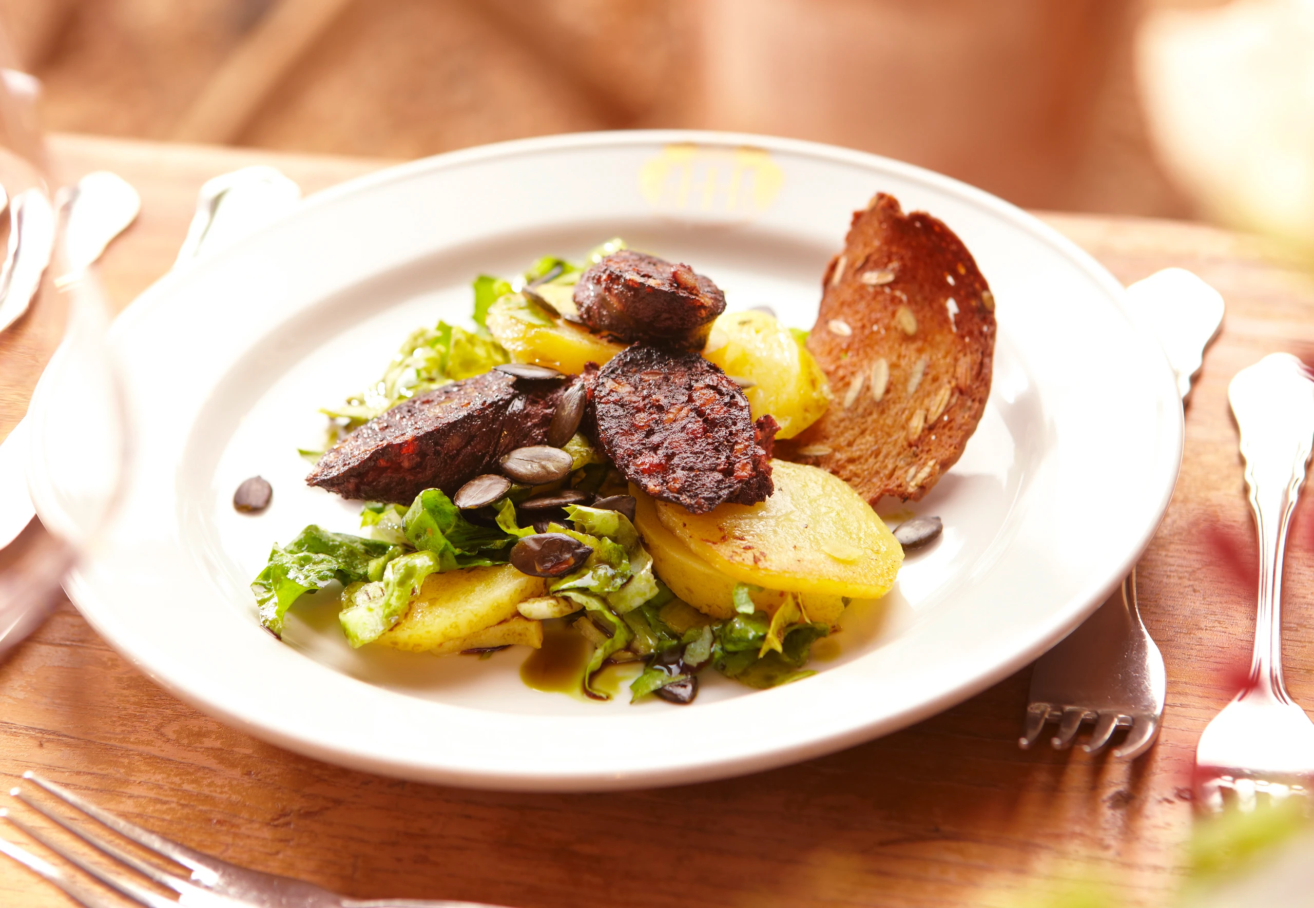 Salat mit der Marinade vermischen. Salat mit Erdäpfel- und Blutwurstscheiben anrichten, mit Kürbiskernen und Brotscheiben garniert servieren.