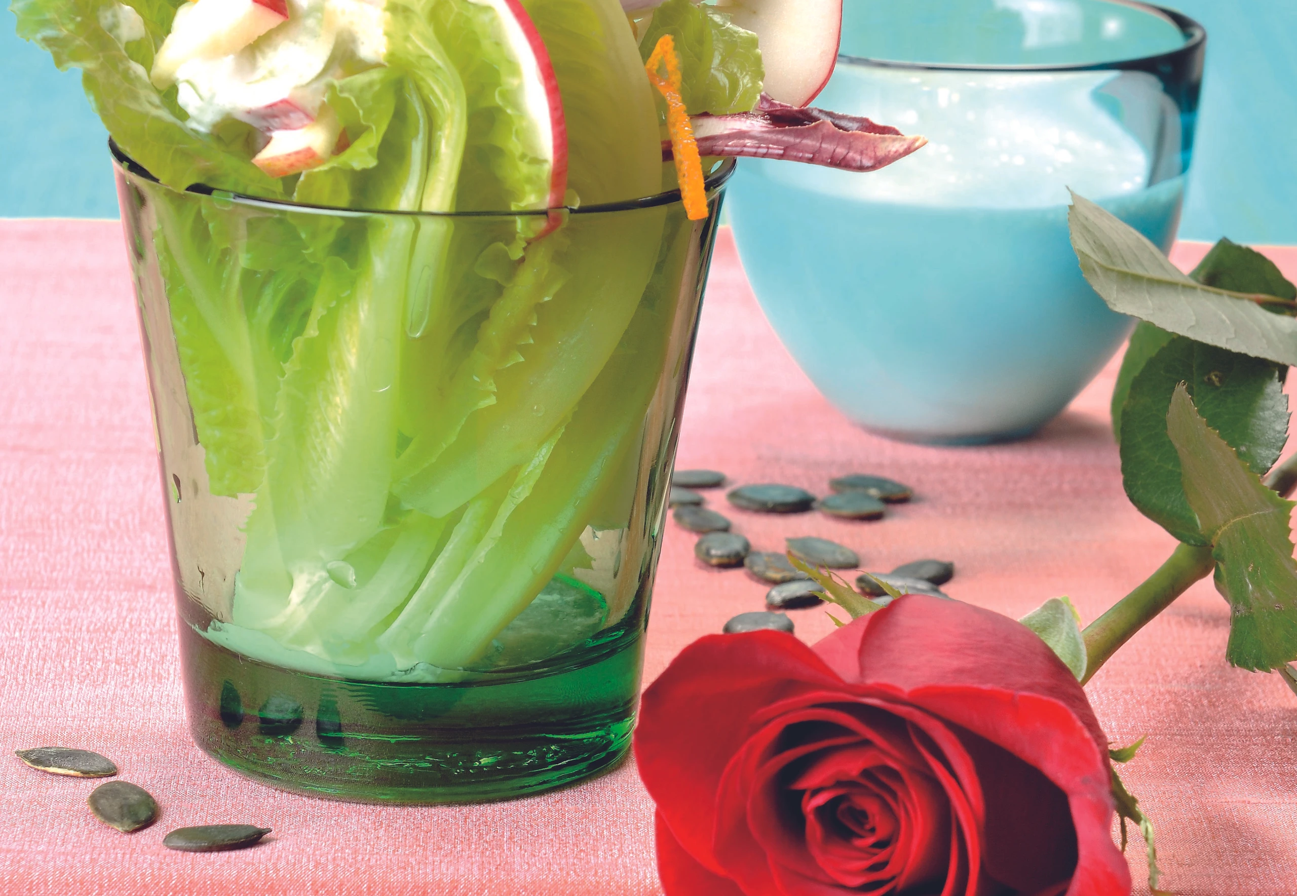 - Apfelwürfel und Sellerie mit dem Dressing vermischen. Salatblätter in ein hohes Glas geben, den Apfel-Selleriesalat einfüllen. Salat mit Kürbiskernen bestreuen, mit Apfelscheiben und Orangenzesten garnieren.