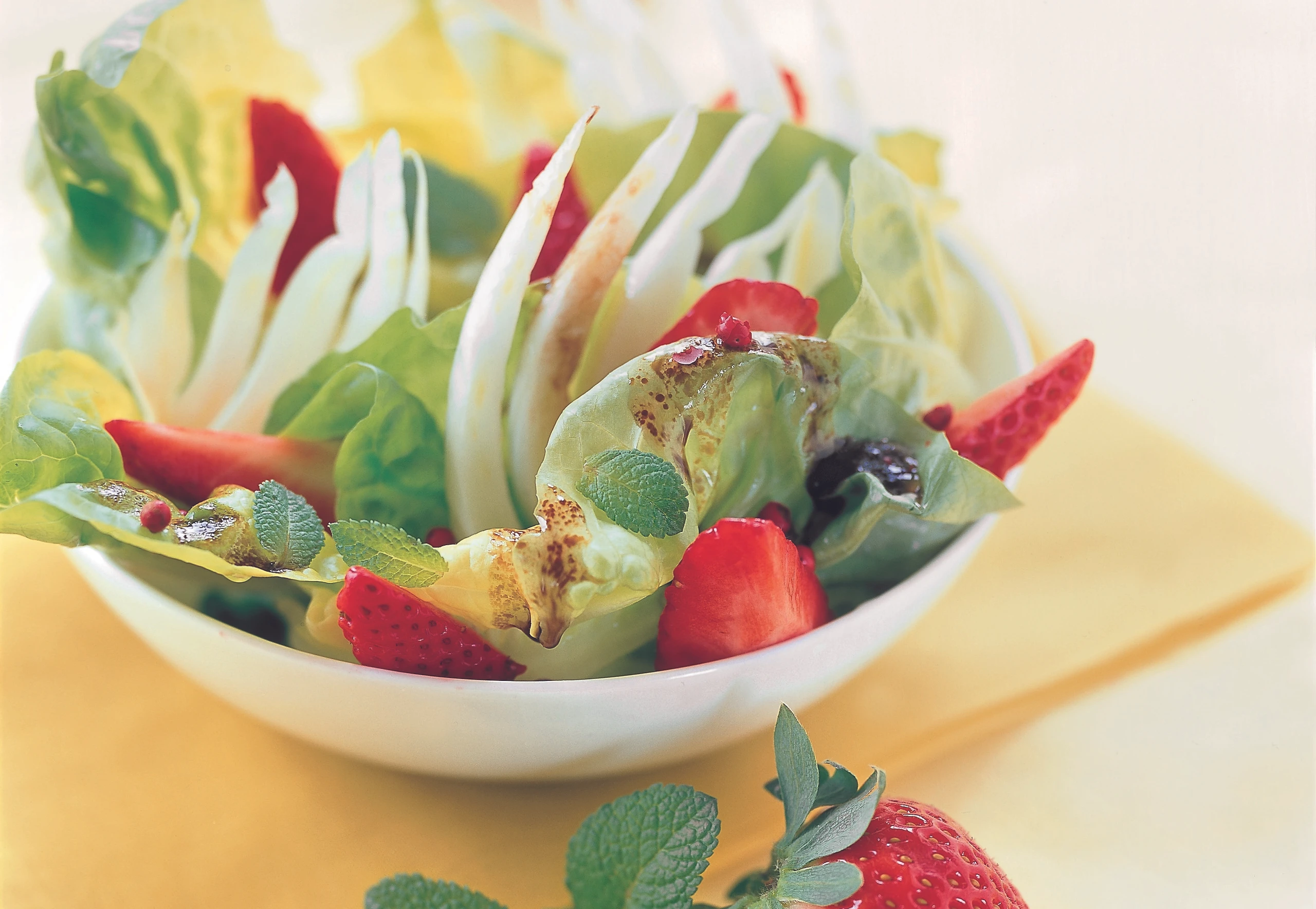 Salat mit Erdbeeren, Fenchel, Minze und Orangen-Balsamico-Dressing