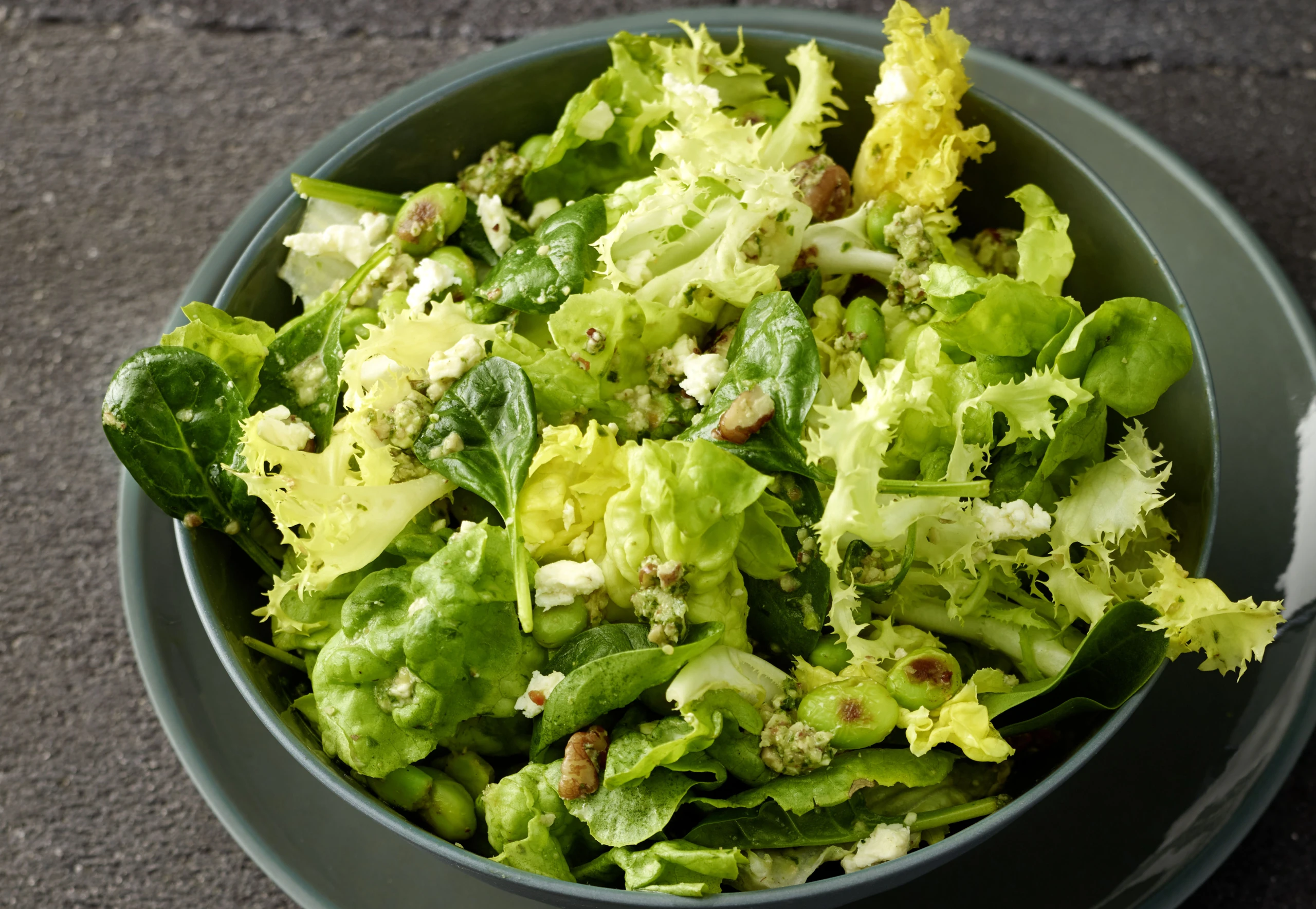 Für den Salat Sojabohnen in Butter anschwitzen, salzen, pfeffern und zugedeckt bissfest dünsten. Bohnen umfüllen und abkühlen lassen. Salate zerpflücken, waschen und abtropfen lassen. Vom Spinat grobe Stiele entfernen.