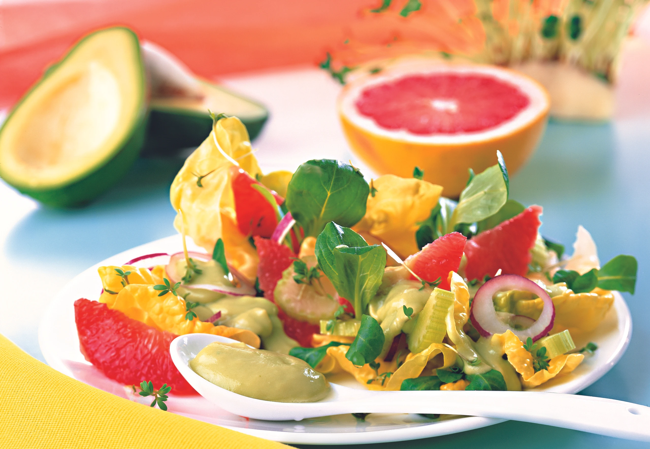 Grapefruit mit einem scharfen Messer schälen, die Spalten zwischen den Trennwänden herausschneiden. Grünen Salat zerpflücken. Zwiebel schälen und in feine Ringe, Sellerie in dünne Scheiben schneiden.
