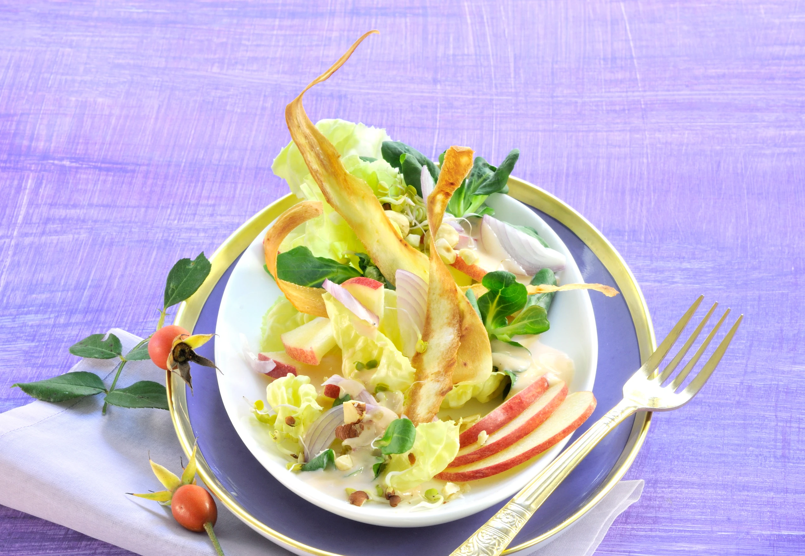 Häuptelsalat, Vogerlsalat, Äpfel und Schalotten anrichten. Dressing über den Salat geben. Salat mit Haselnüssen und Radieschen-Sprossen bestreuen und mit Pastinaken-Chips garnieren.