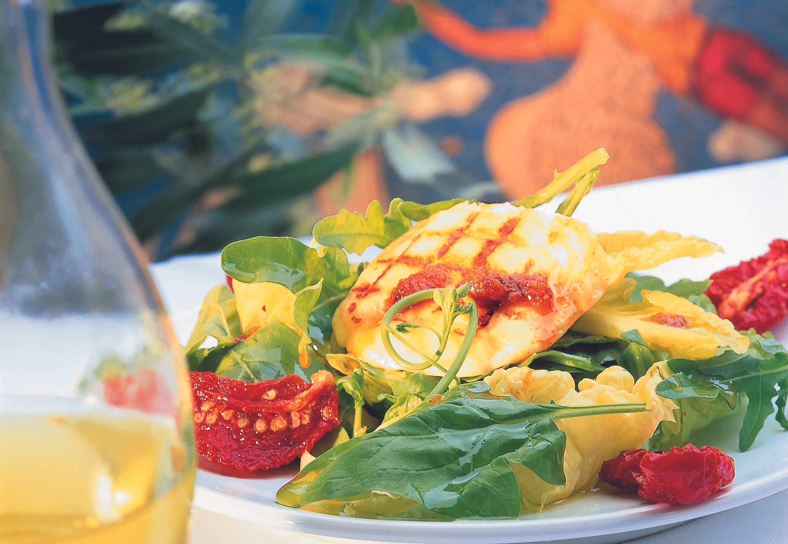 In einer Pfanne 1 EL Öl erhitzen, Käse darin 2–3 Minuten je Seite braten. Auf Küchenpapier abtropfen lassen.